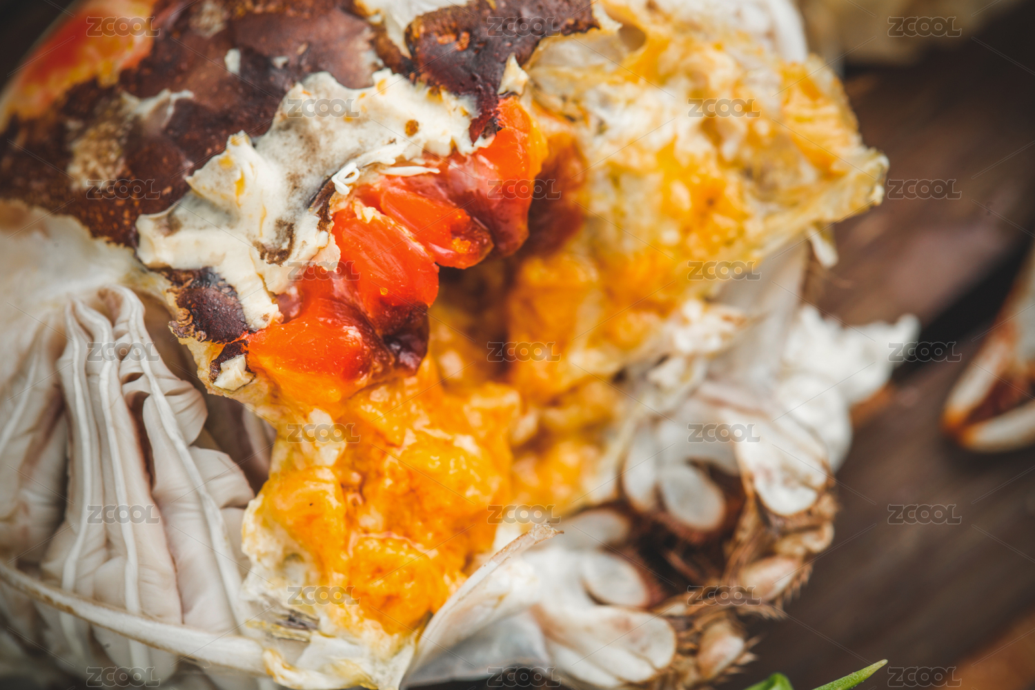 蒸熟剥开的大闸蟹蟹肉蟹黄蟹膏特写