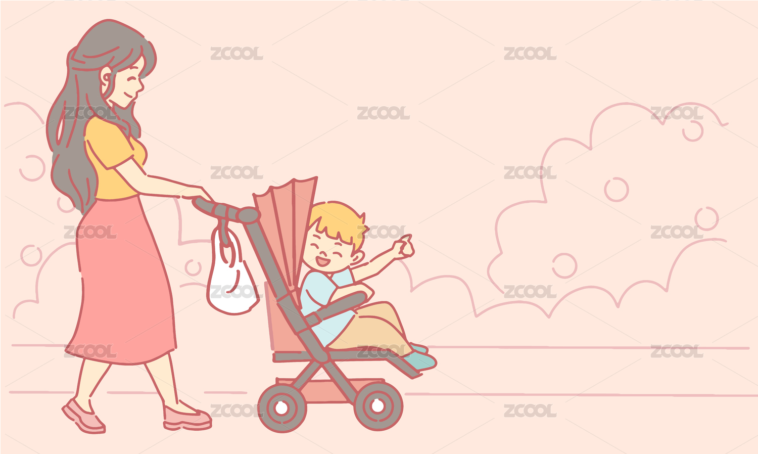 妈妈推着坐着婴儿车的宝宝在路上走