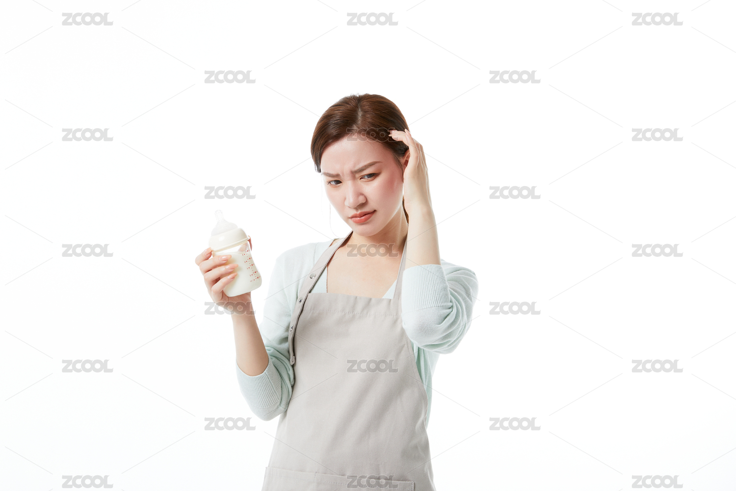 新手妈妈拿着奶瓶皱眉头表情困惑