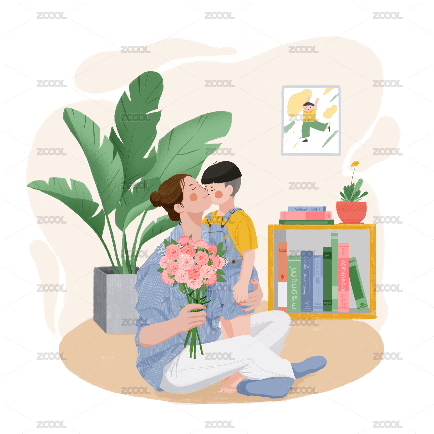 母亲节插画:女儿拥抱着母亲,妈妈辛苦了~爱你!