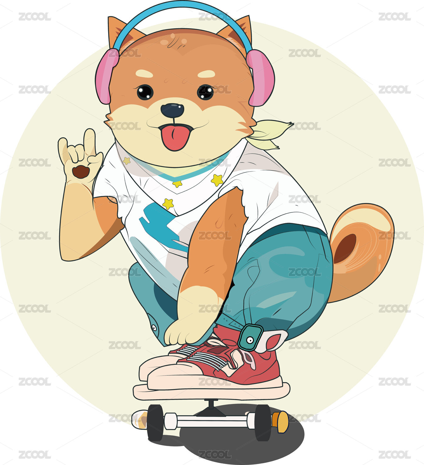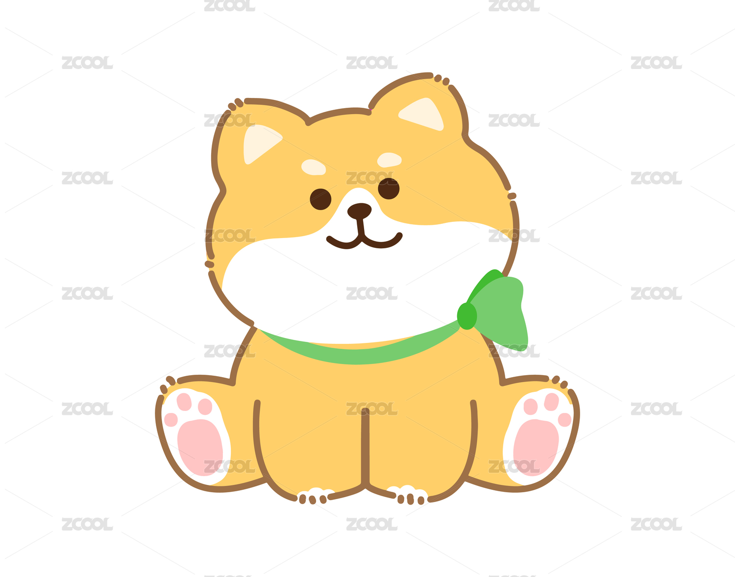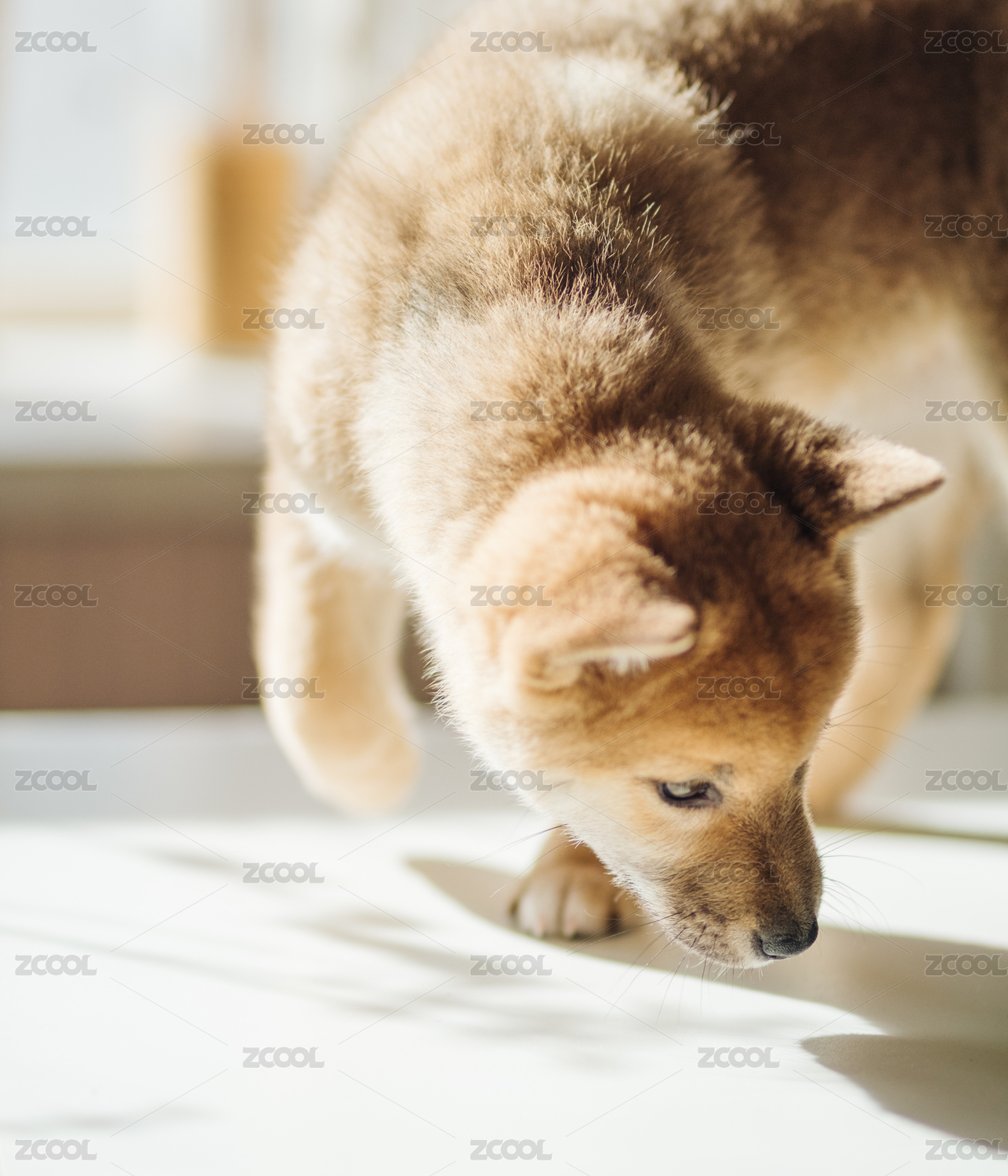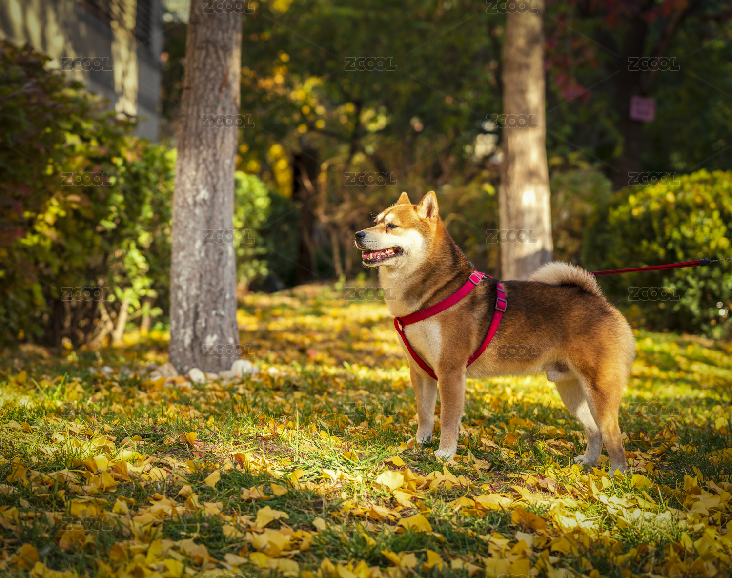 春天阳光下樱花树下一只柴犬狗狗在玩耍