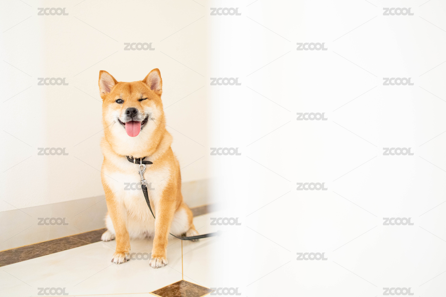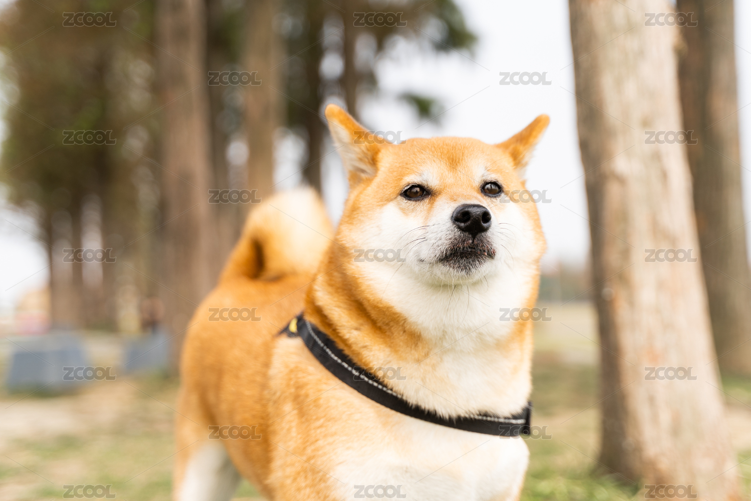 北京春天阳光下一只柴犬狗狗在樱花树下