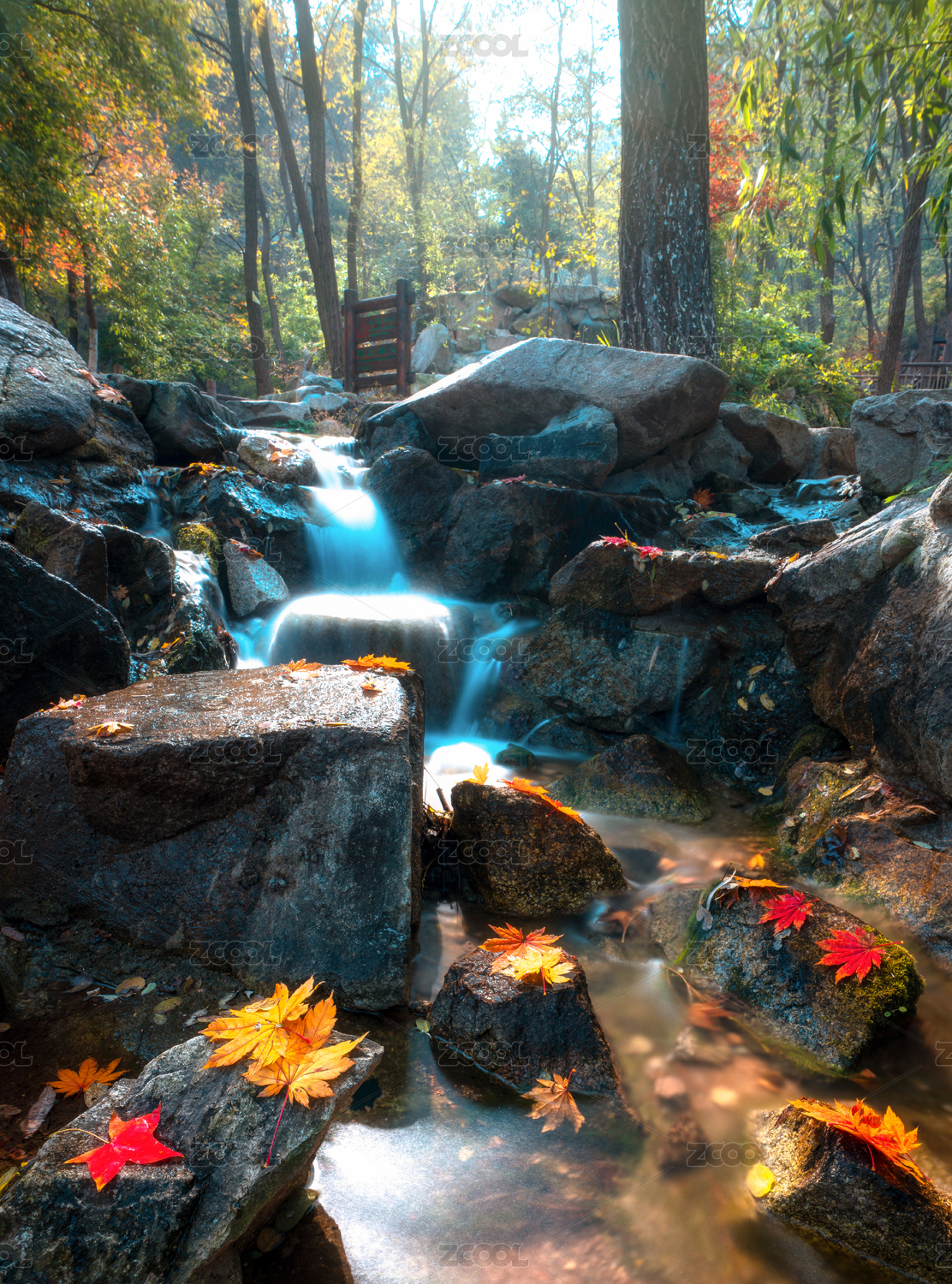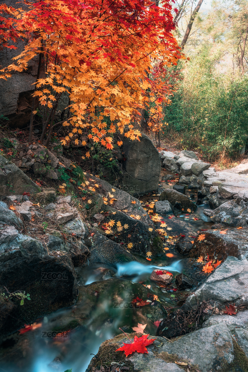 山涧红色枫叶流瀑,中国山东省济南市九如山