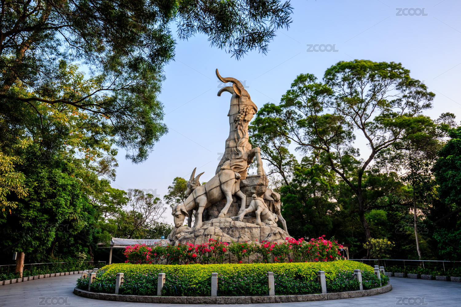 亚洲中国广东省广州市五羊石像正面横构图蓝