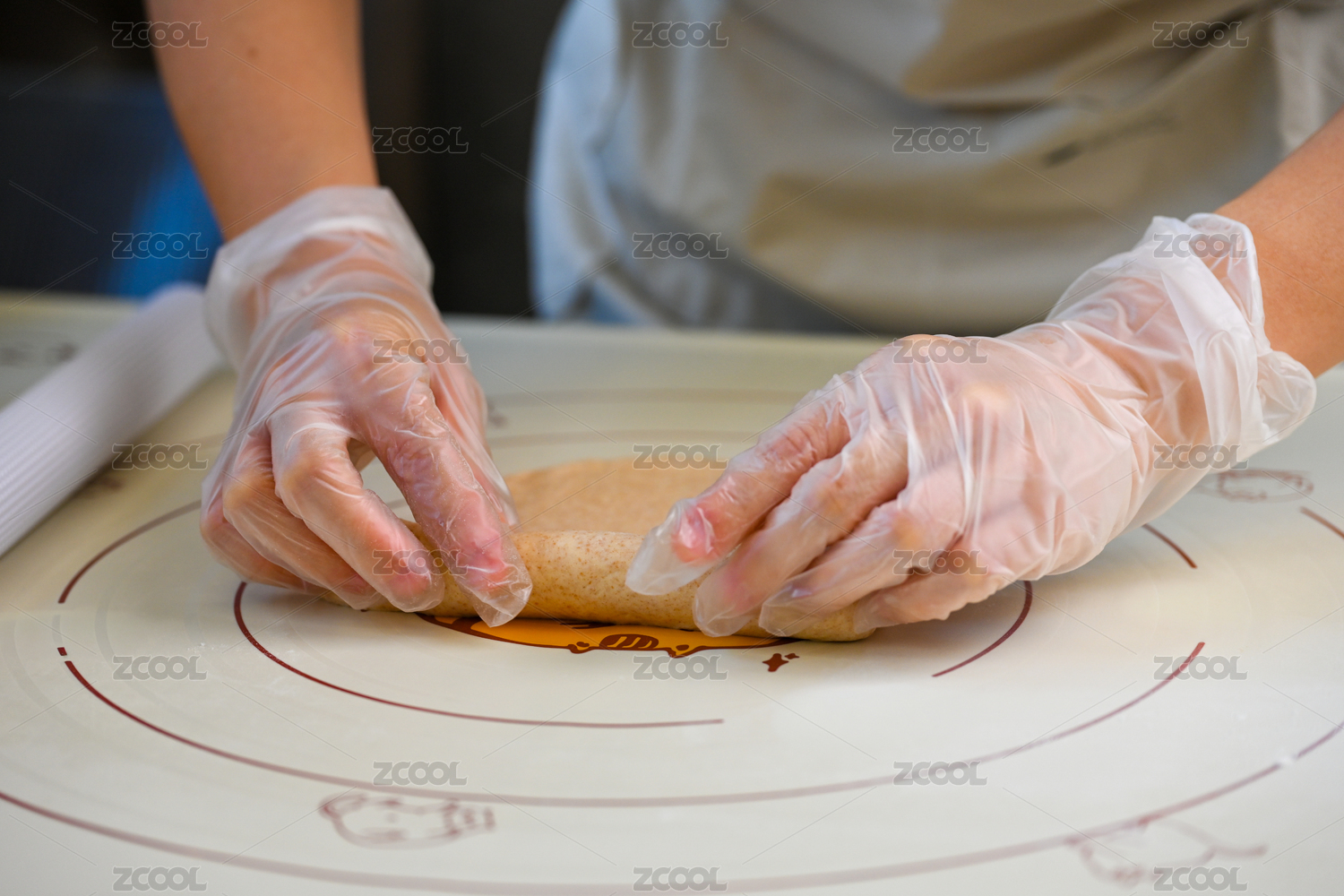 制作面点时戴手套的手正在揉捏面团