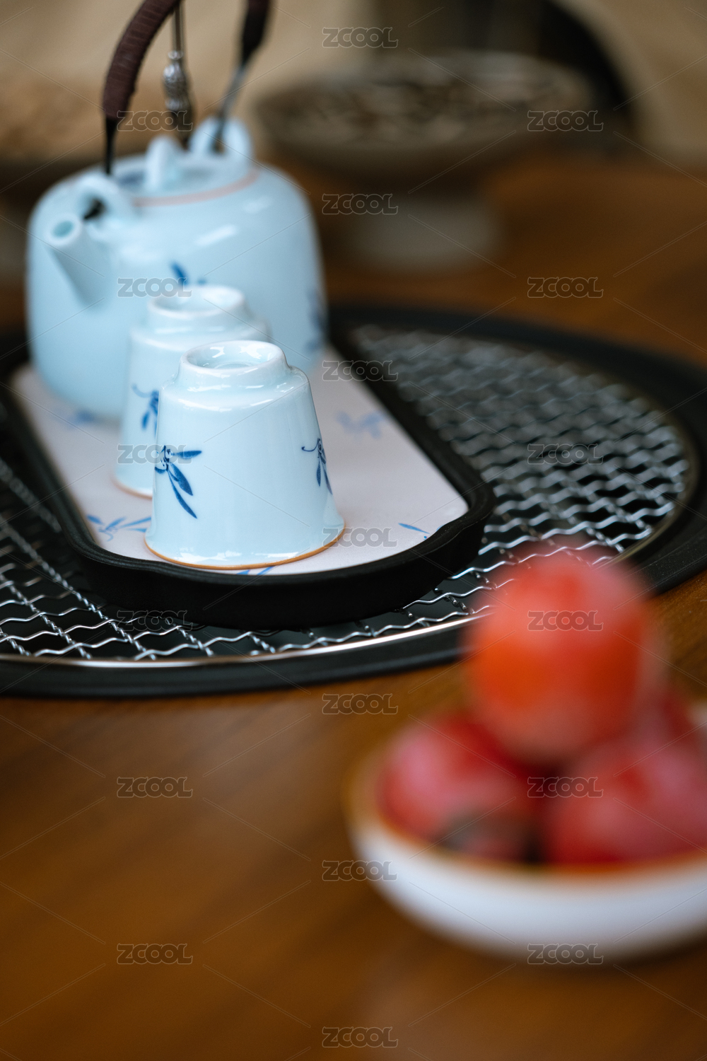 透明玻璃复古茶壶茶杯中的湖蓝色饮料,在白色背景中的静物摄影,