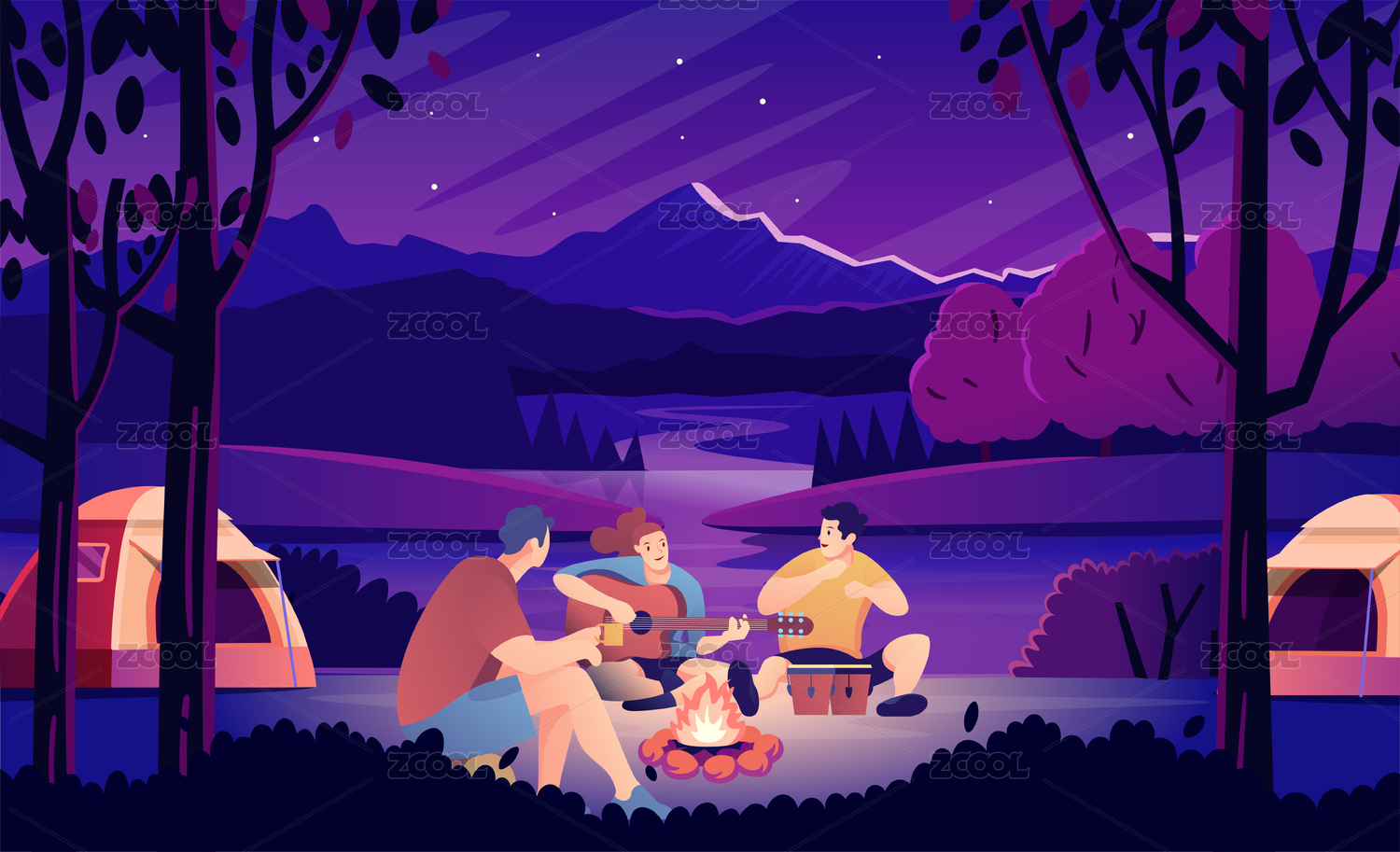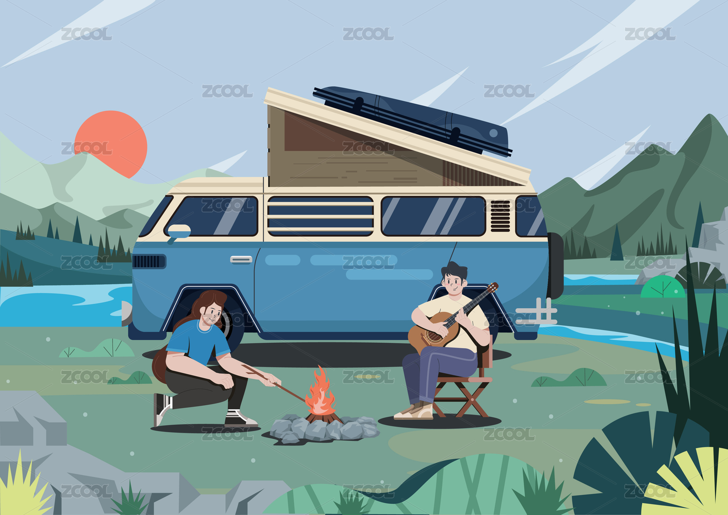 扁平矢量人物野外露营娱乐吉他房车篝火