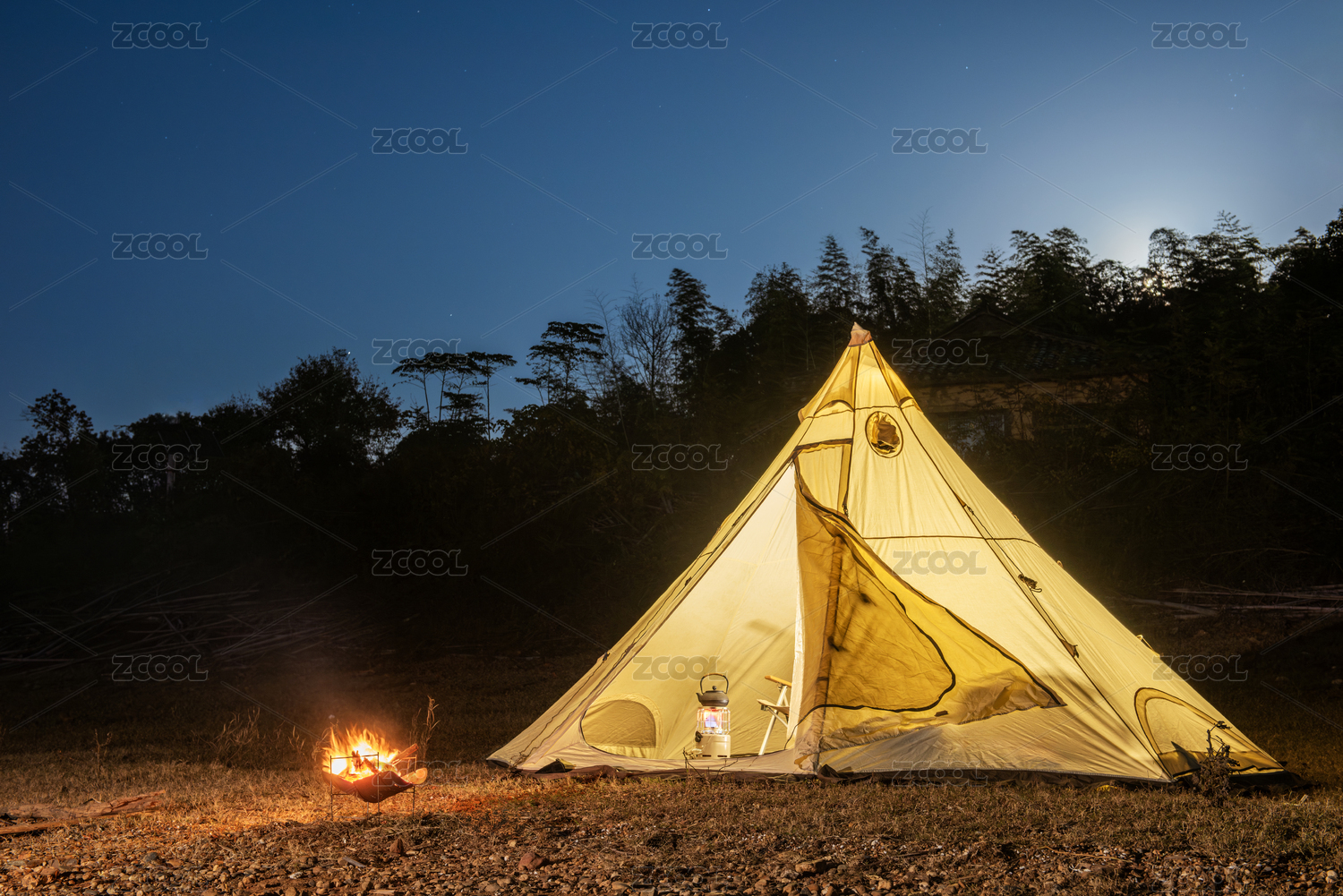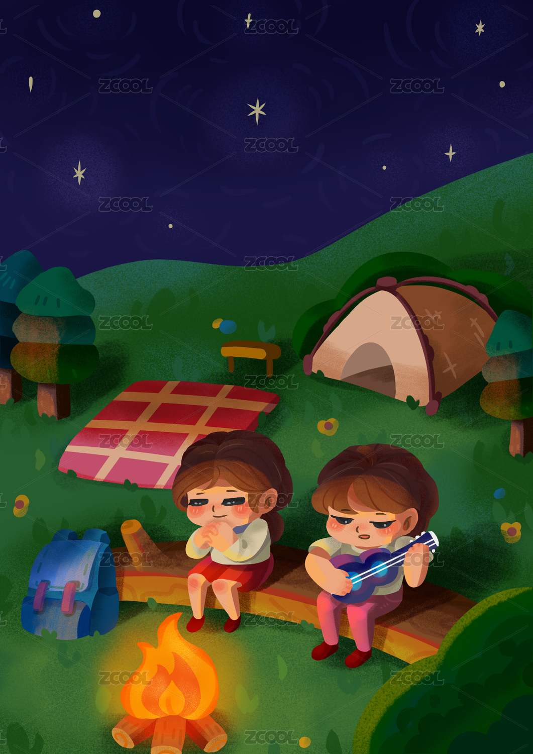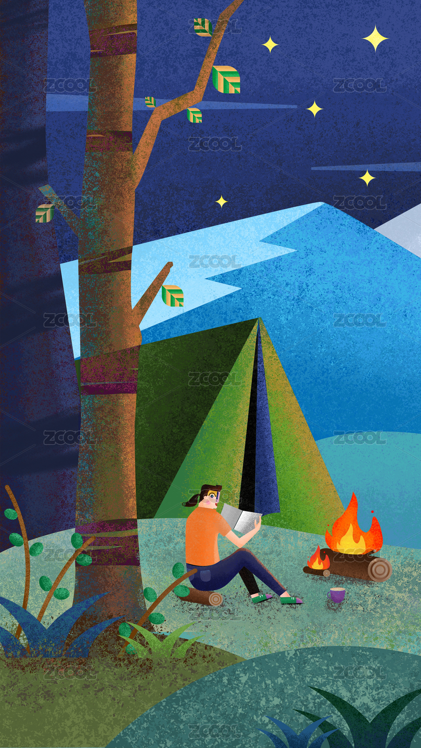 扁平化手绘线条风格户外露营越野篝火野餐睡