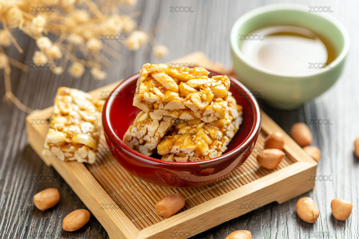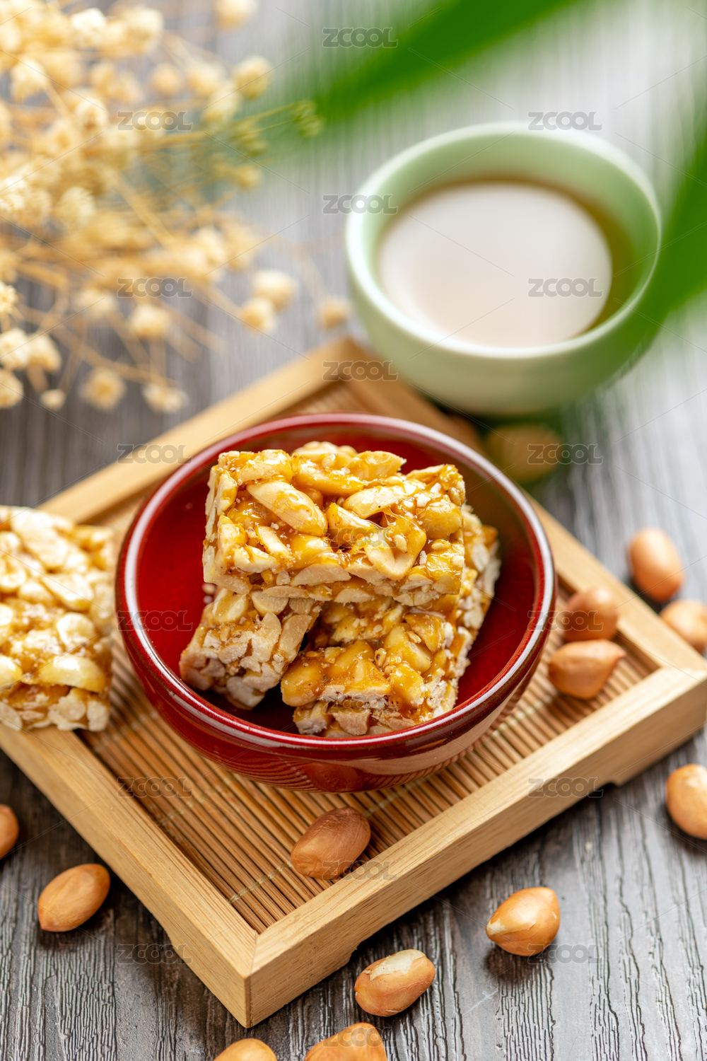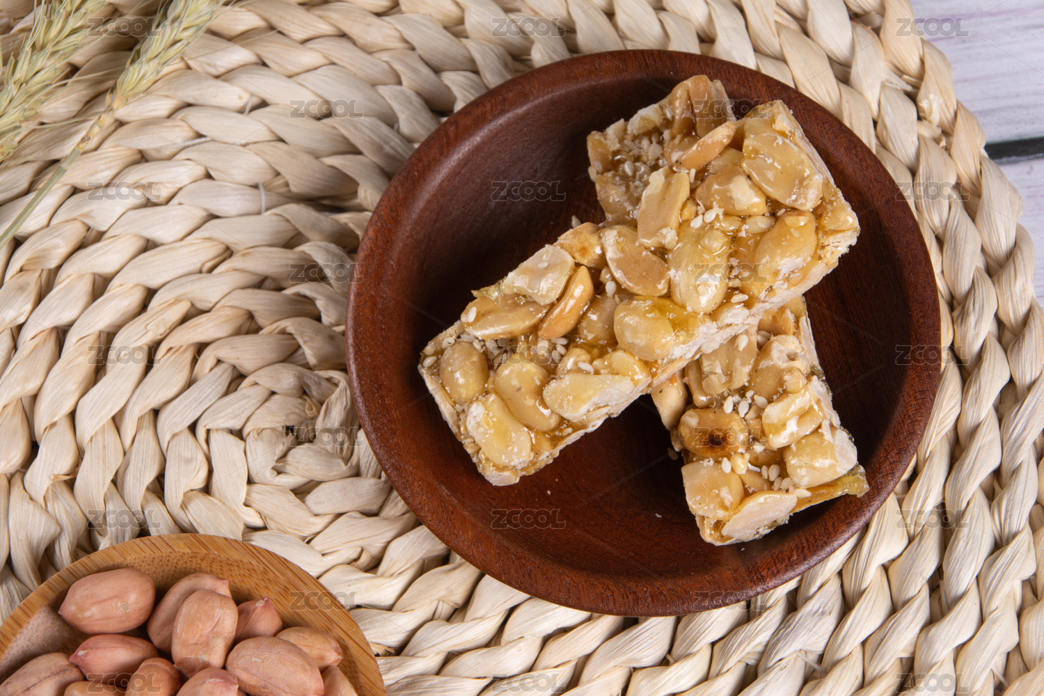 编织麻垫子上的花生糖