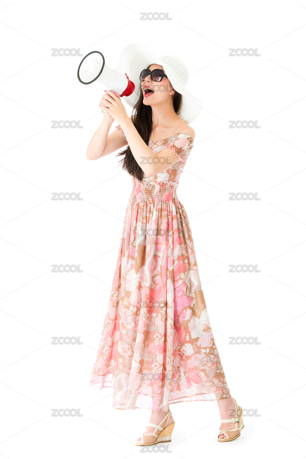 幸福的微笑叫卖女子用扩音器说着隔绝在白色背景。