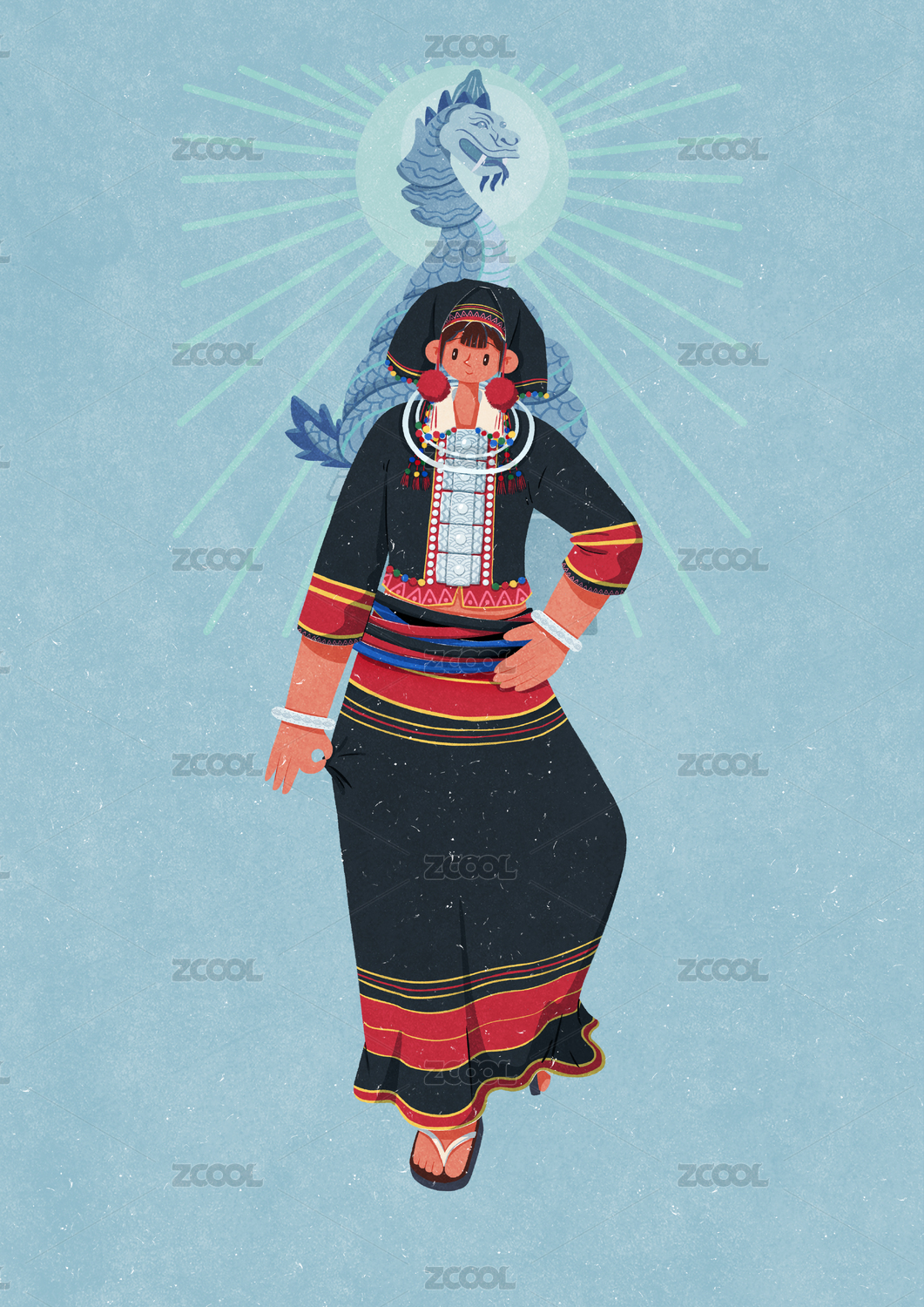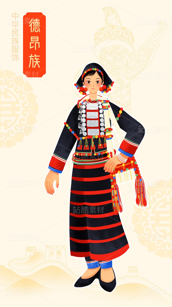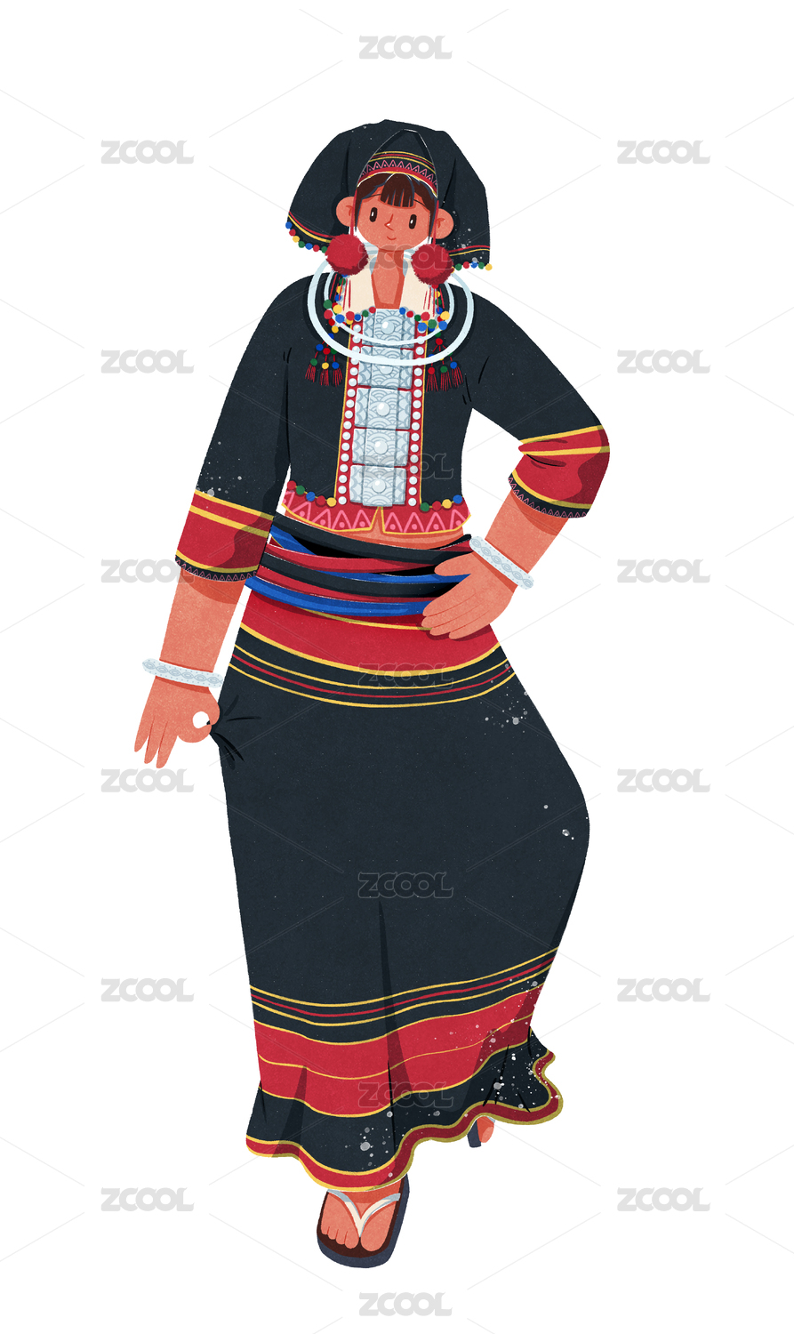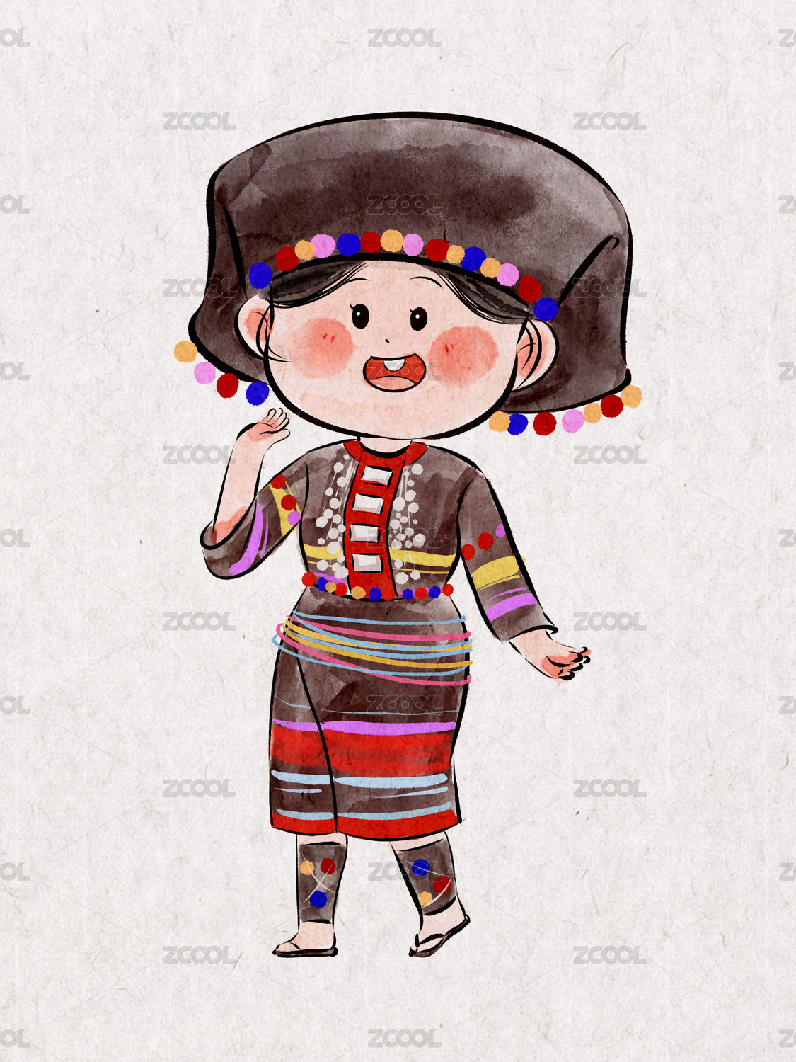 中国五十六个民族德昂族少女盛装女性服饰插画