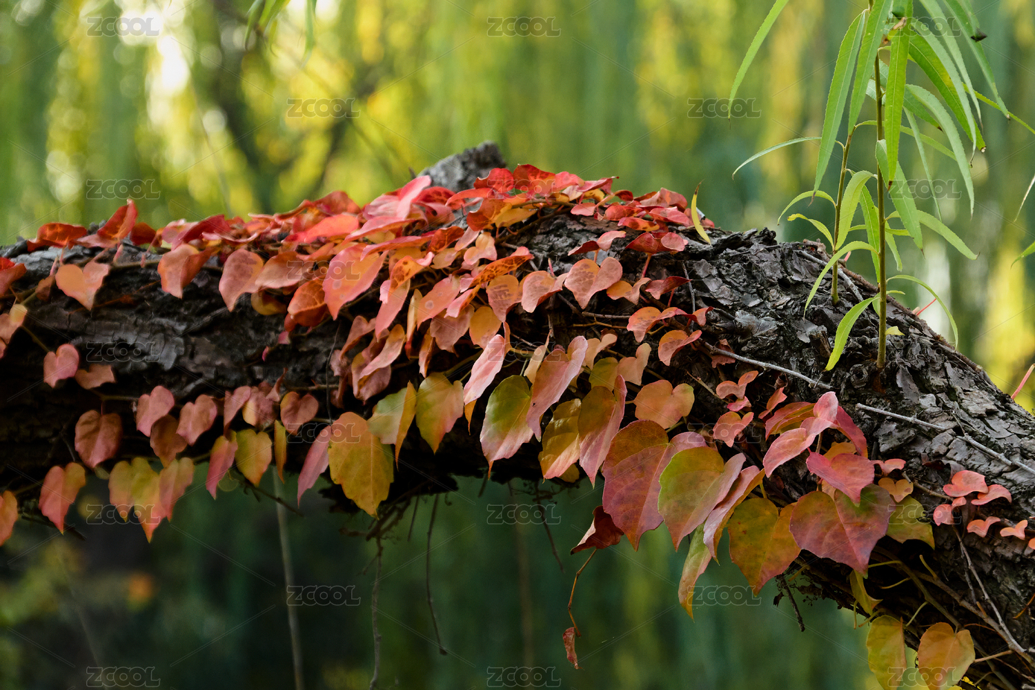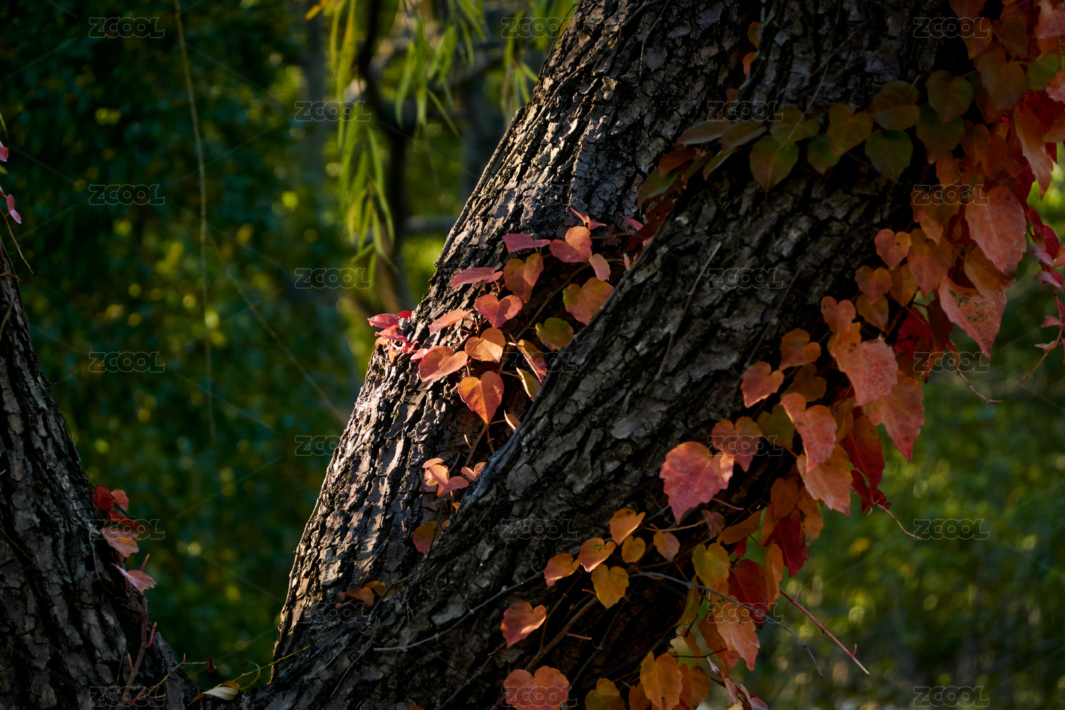 冬日藤蔓依附石墙,残留红叶在光影中透亮