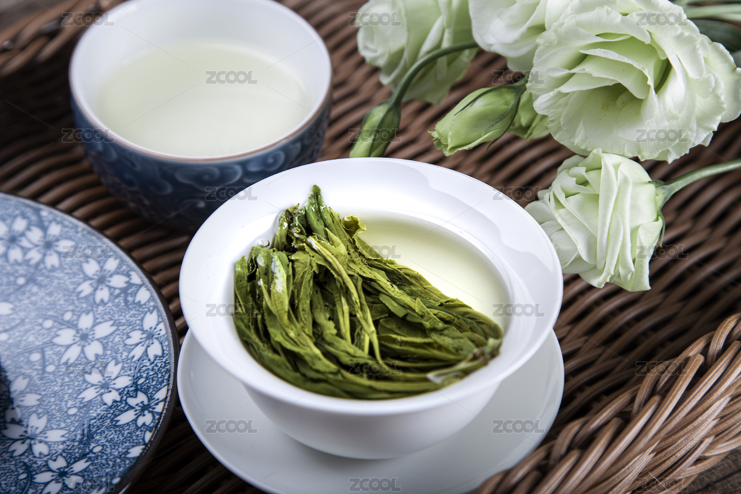 藤筐上放着的德化白瓷盖碗里面放着太平猴魁叶底和景德镇茶杯装着的黄绿透亮的太平猴魁茶汤,背景还有几支浅绿色桔梗鲜花