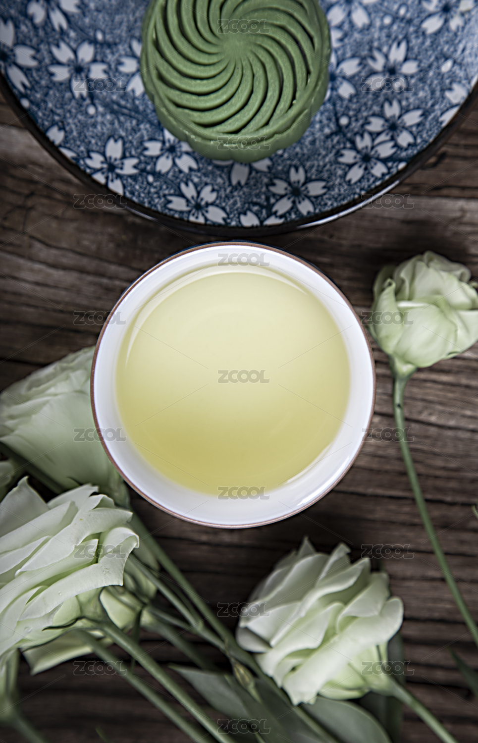 花好月圆,中秋节吃月饼,景德镇品茗杯里面盛满了太平猴魁黄绿透亮的茶汤,还有放在青花磁盘里面的绿色抹茶月饼,下面放着绿色桔梗鲜花