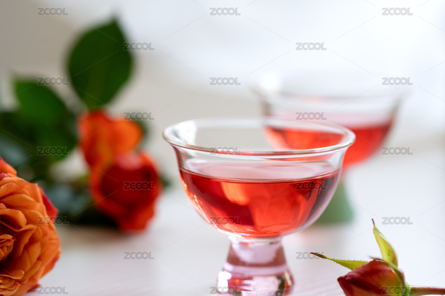 木桌上一瓶澄黄透亮的锥形瓶梅子酒和一杯梅子酒