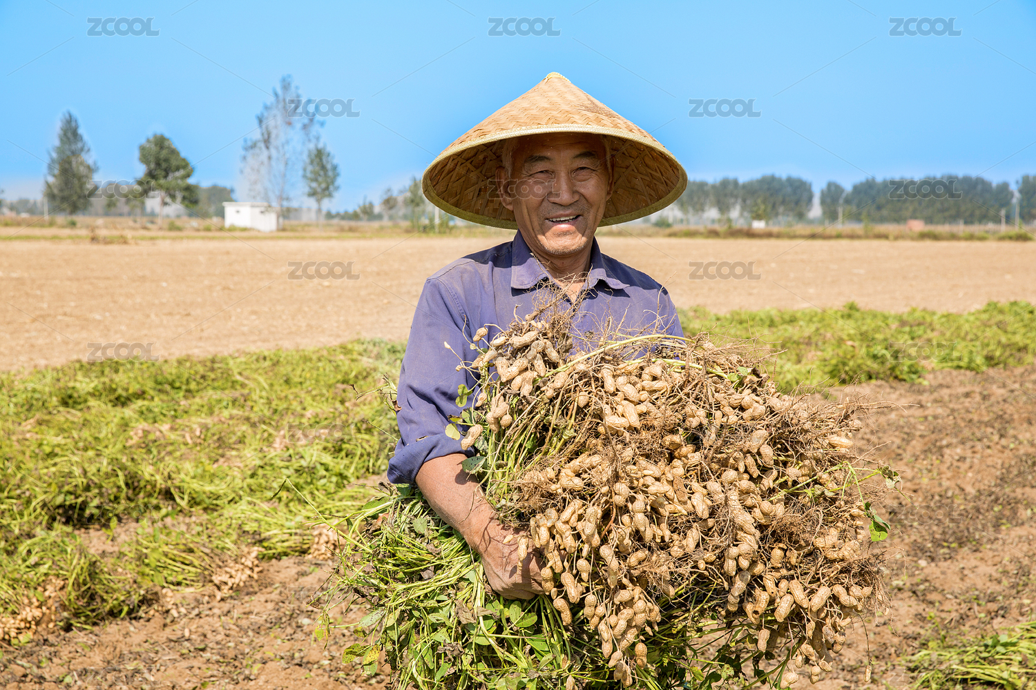 一个戴着斗笠的农夫端着一碗白米饭在农田里
