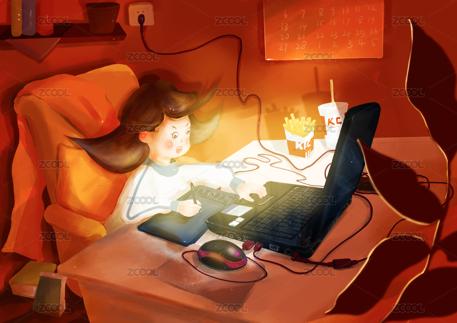 绿头发的小女孩儿在努力的画画,还有插画师男朋友