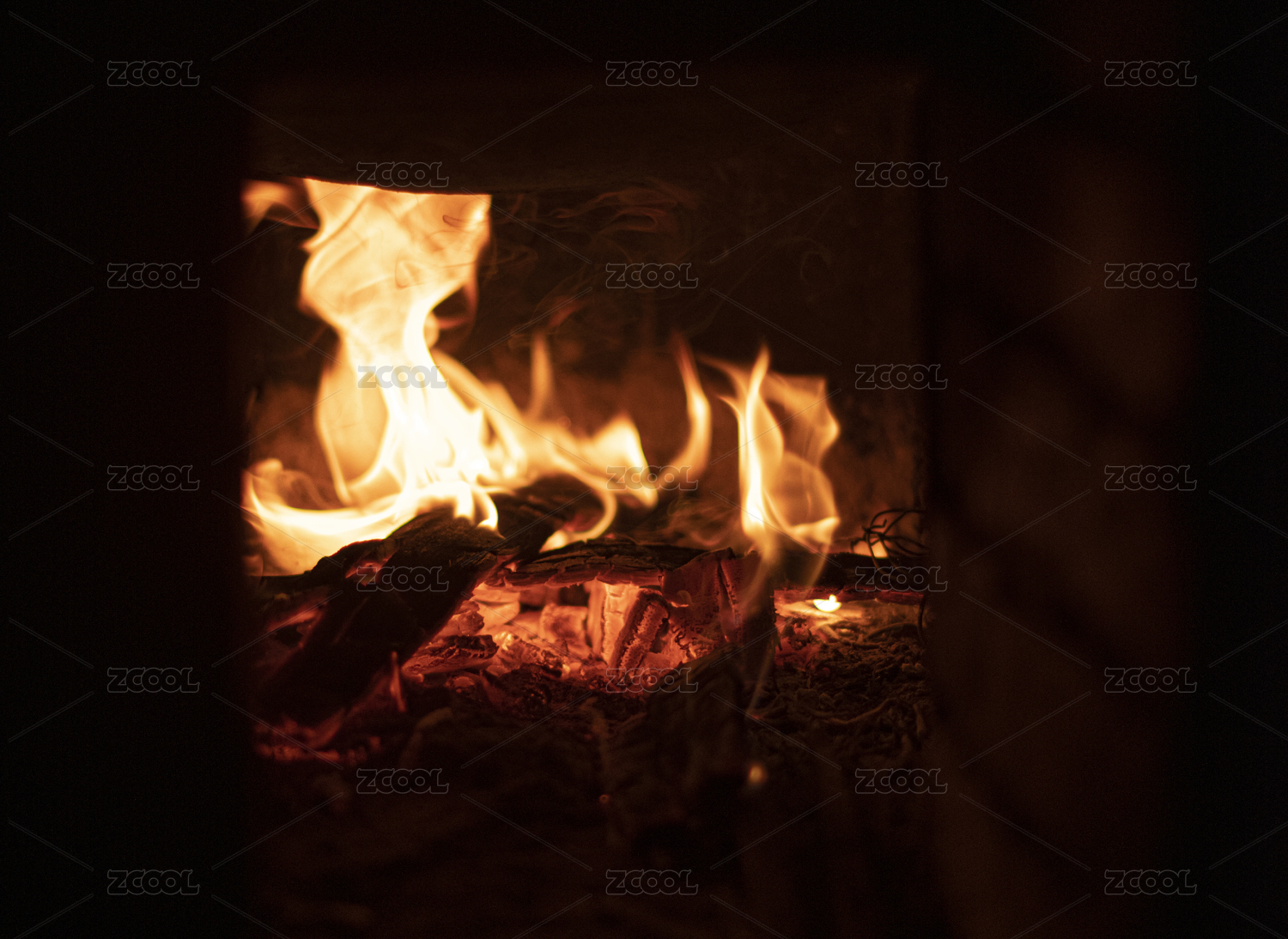做饭灶台下火炉中木柴燃烧的火焰