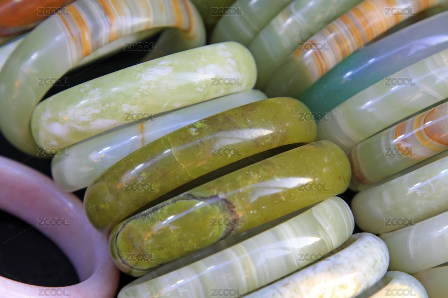 多色玉石手镯堆叠展示