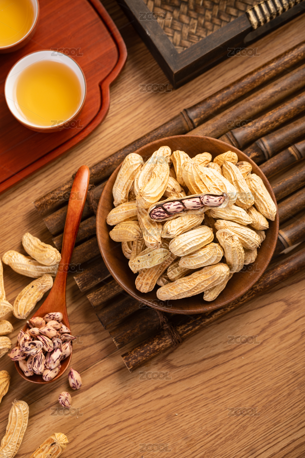 复古场景中用白瓷碟装着的云南七彩花生俯拍