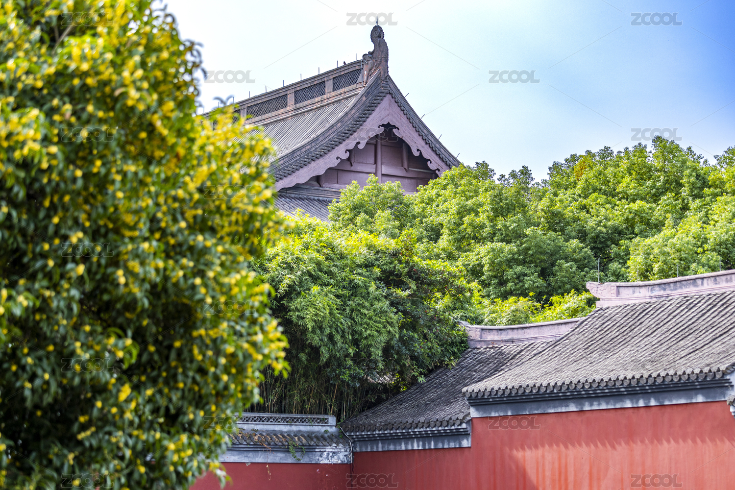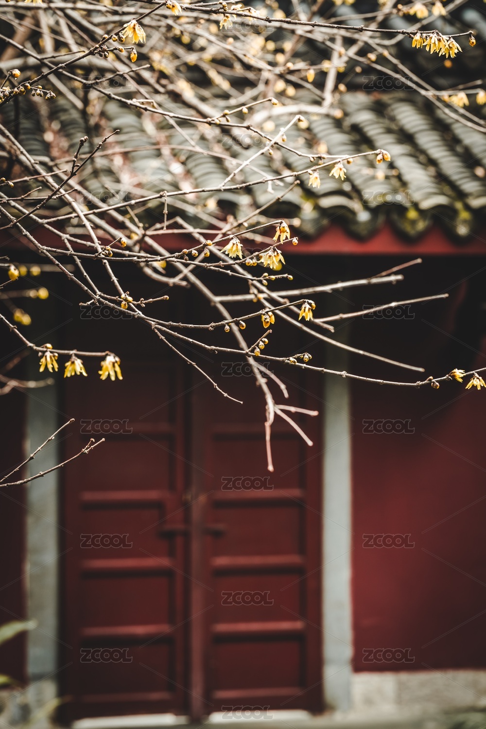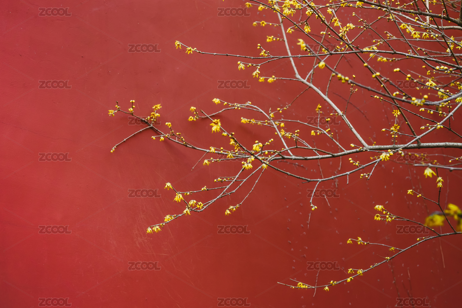 浙江杭州钱王祠的红色背景黄色腊梅