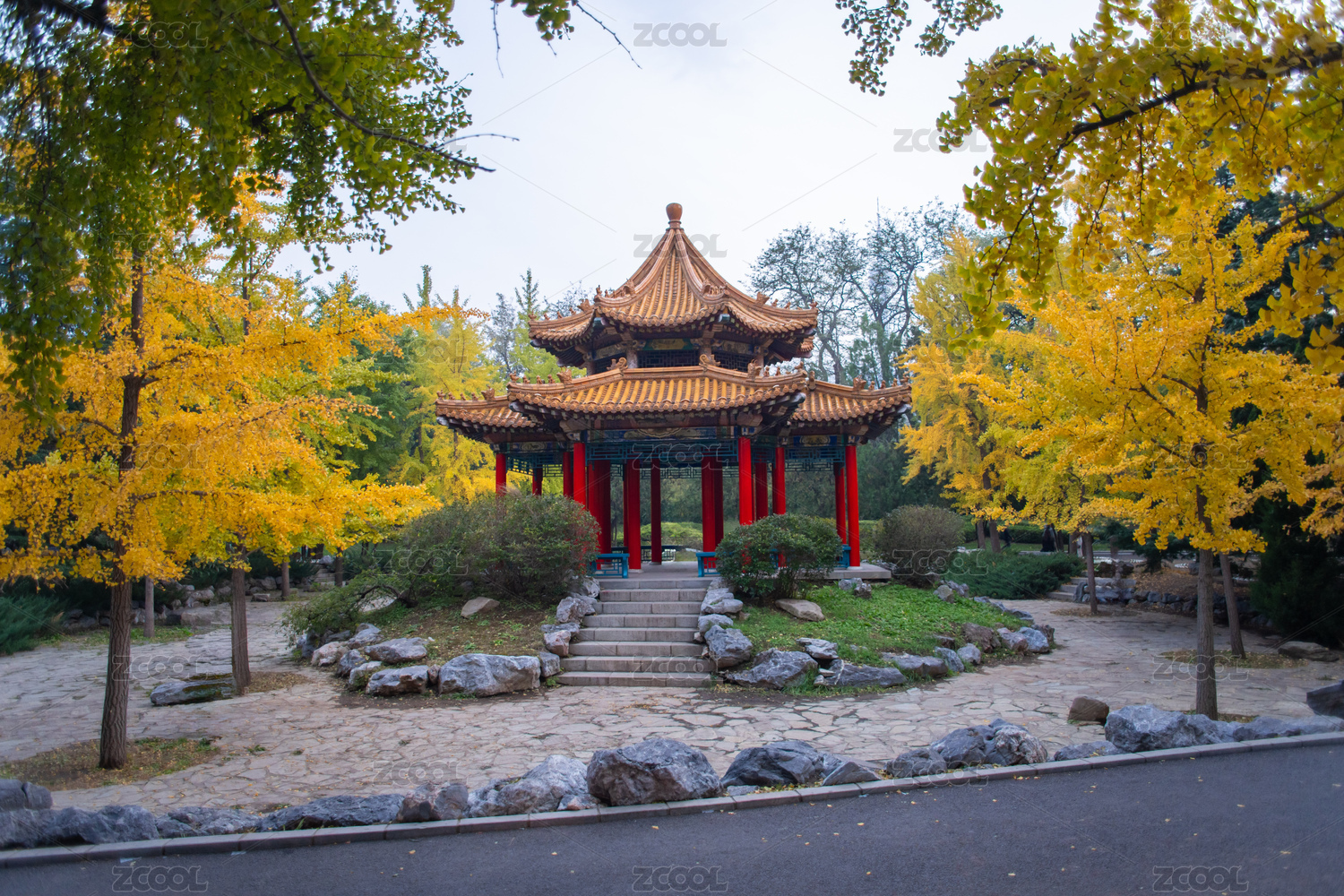 大连劳动公园中式亭子旁金黄银杏景观