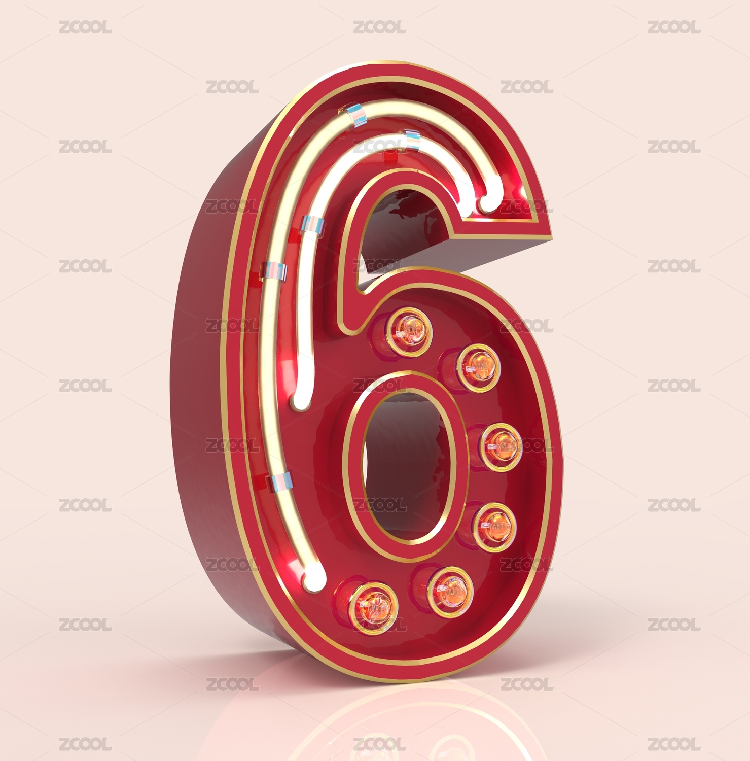 3D立体数字6红色金属质感发光灯带