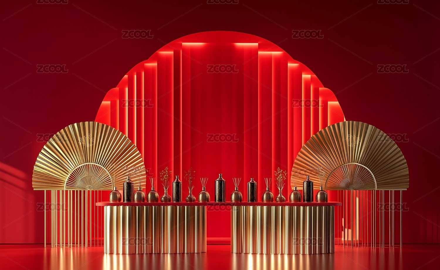 喜庆红色背景金色装饰品陈列台