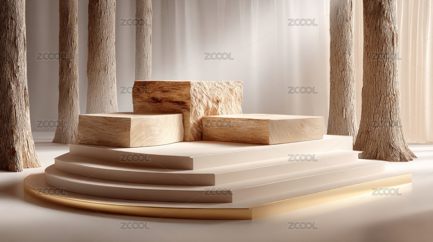 木质陈列台与树木背景