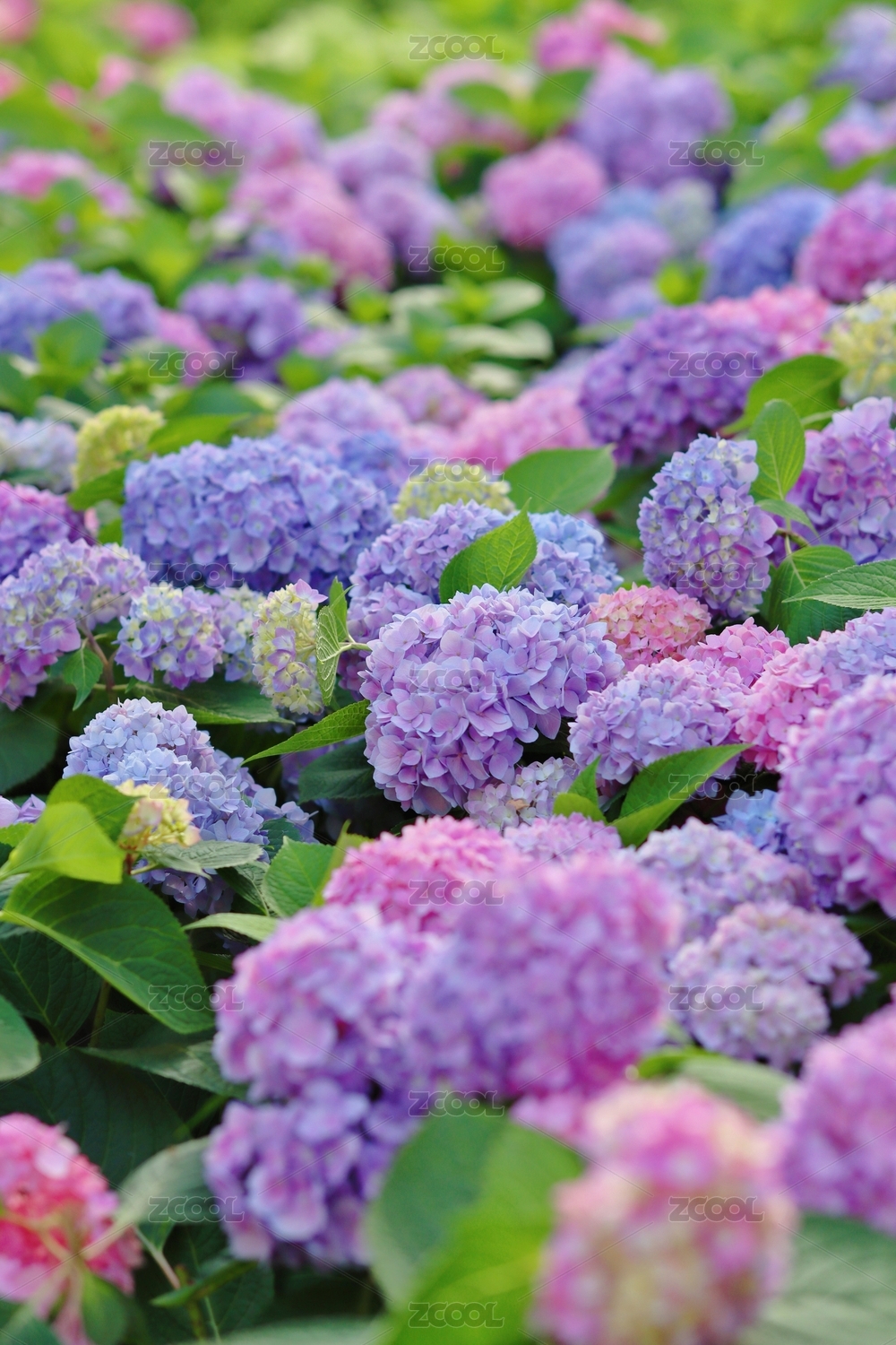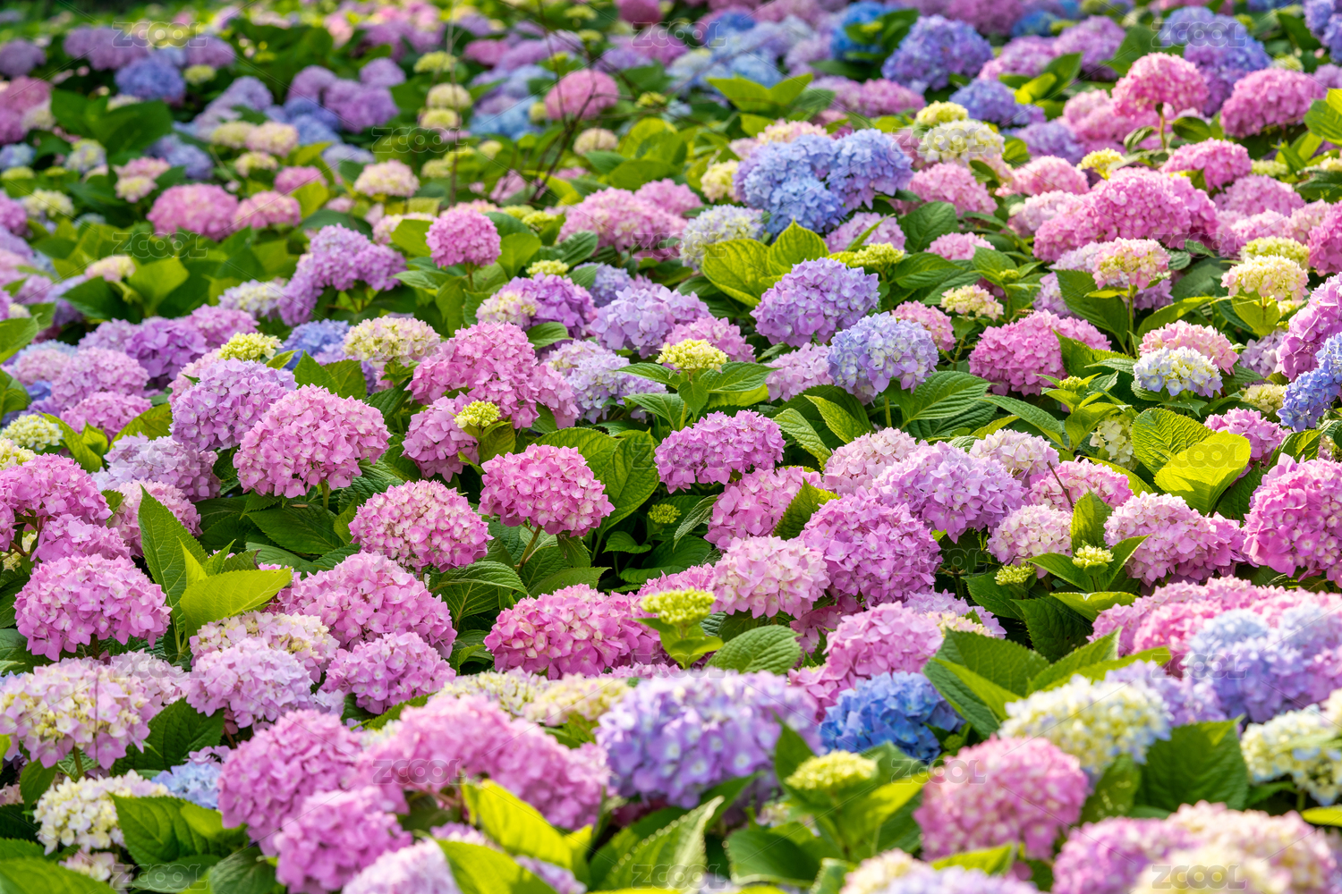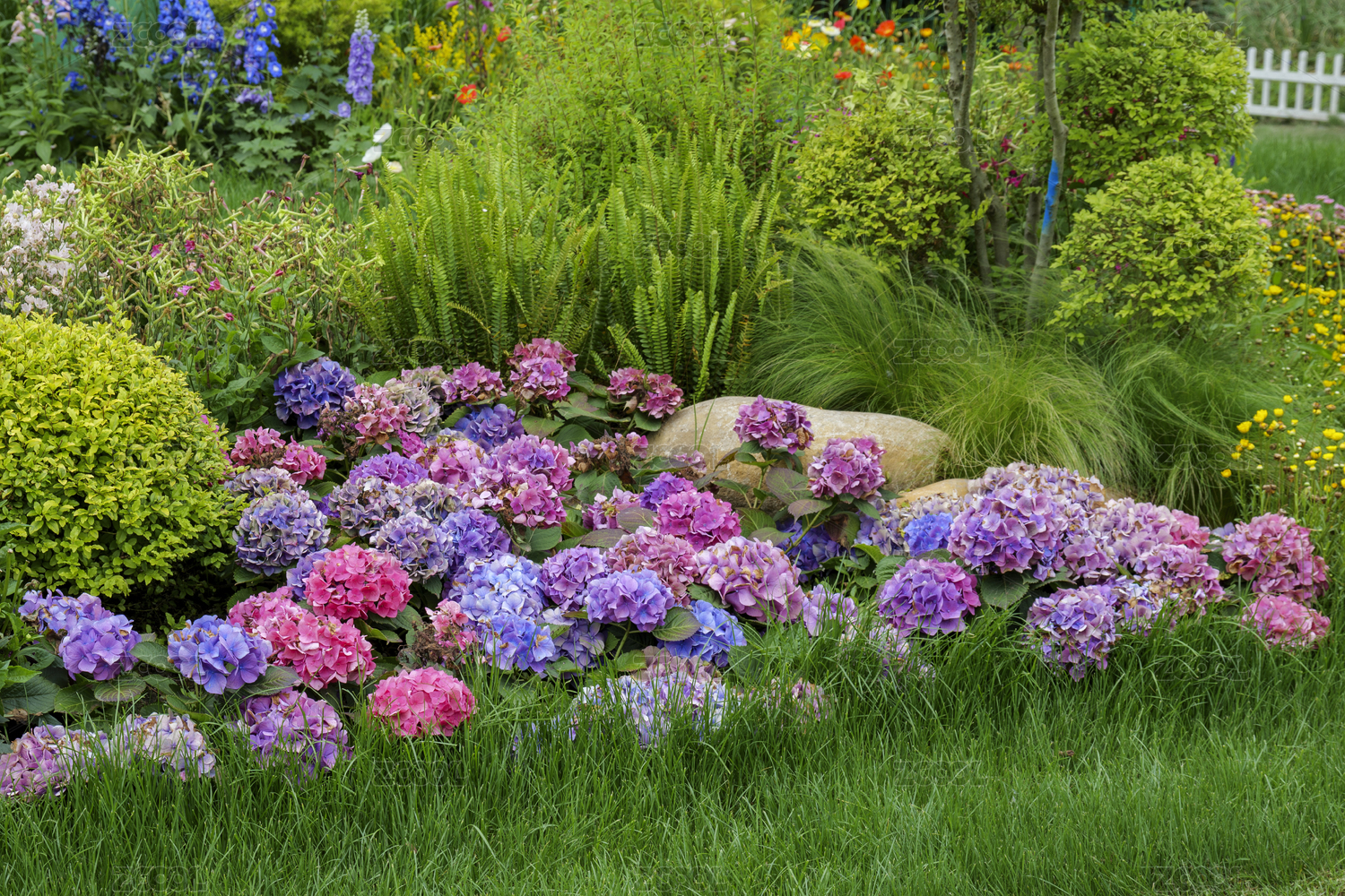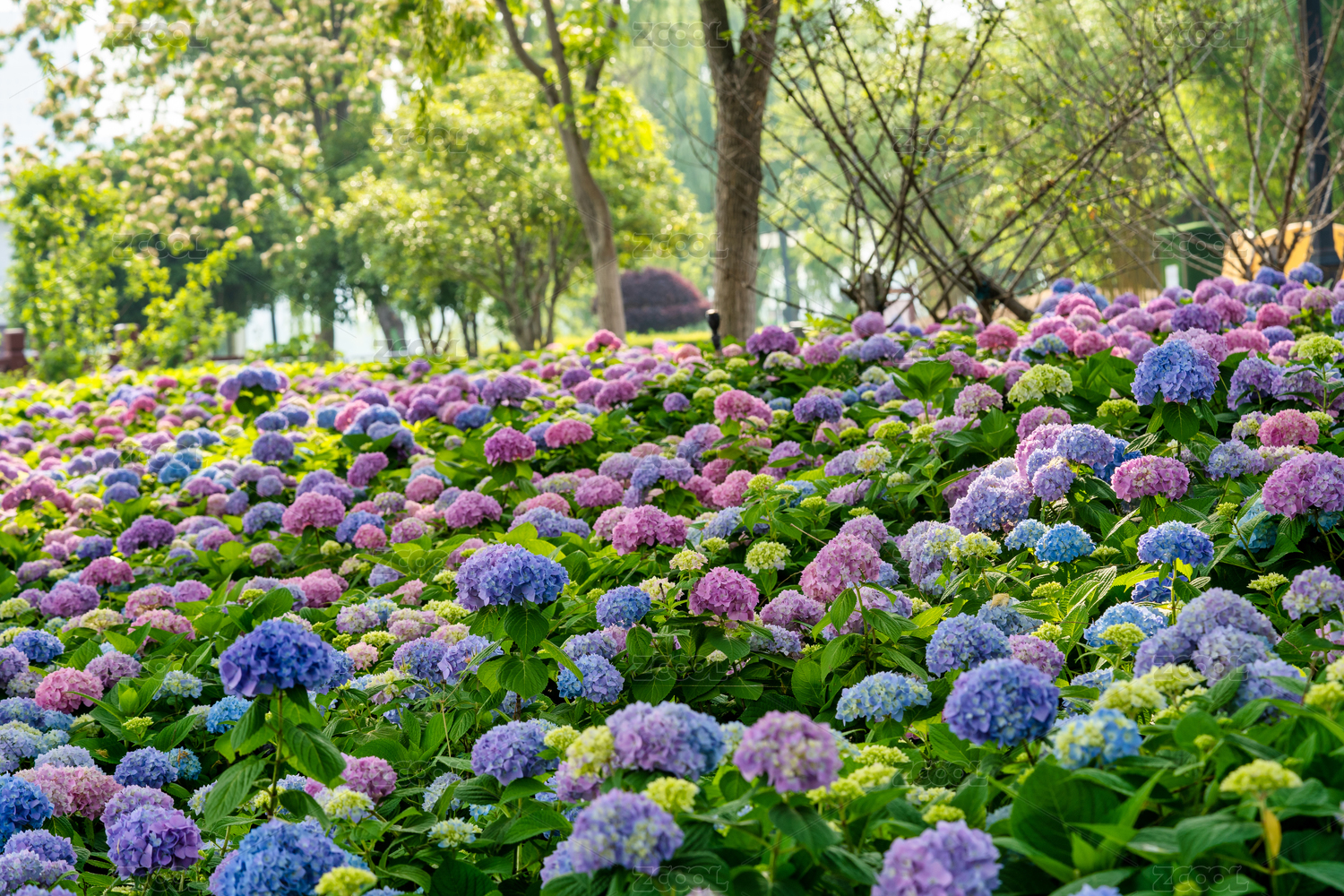 公园草坪上盛开的红色和紫色无尽夏花丛