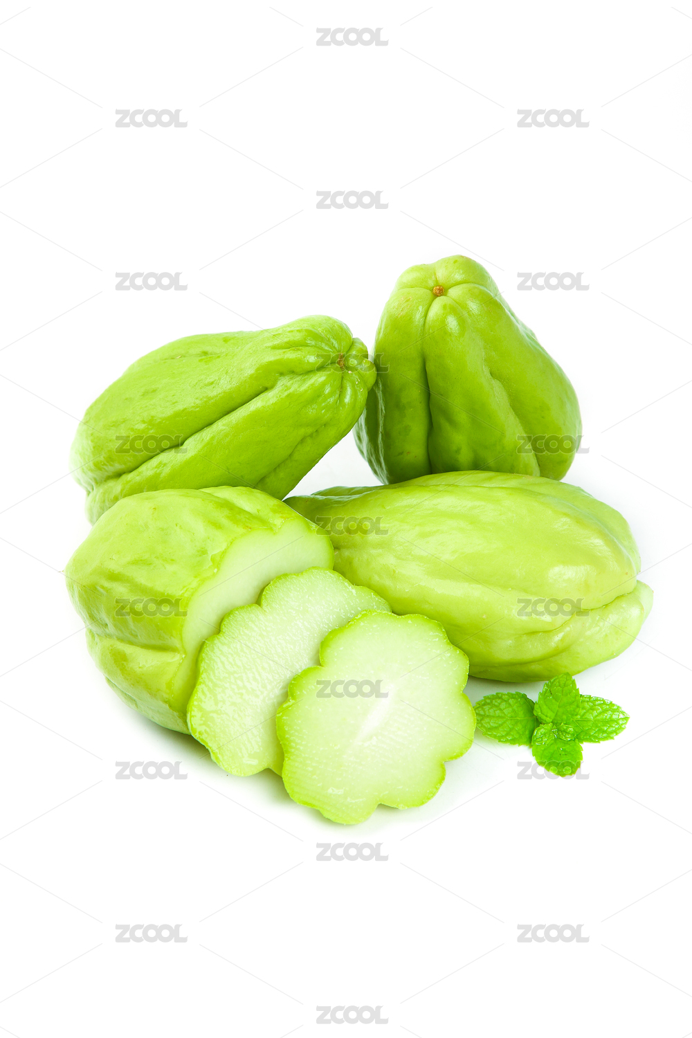 白底上放着一堆新鲜佛手瓜和切开的佛手瓜