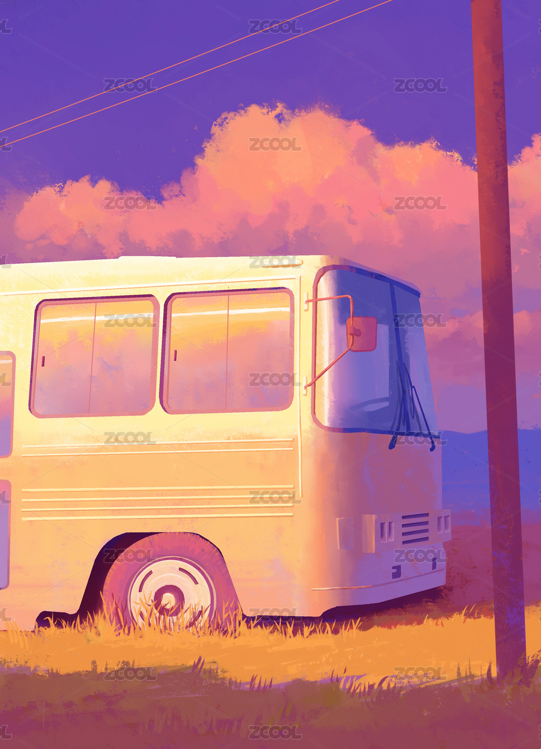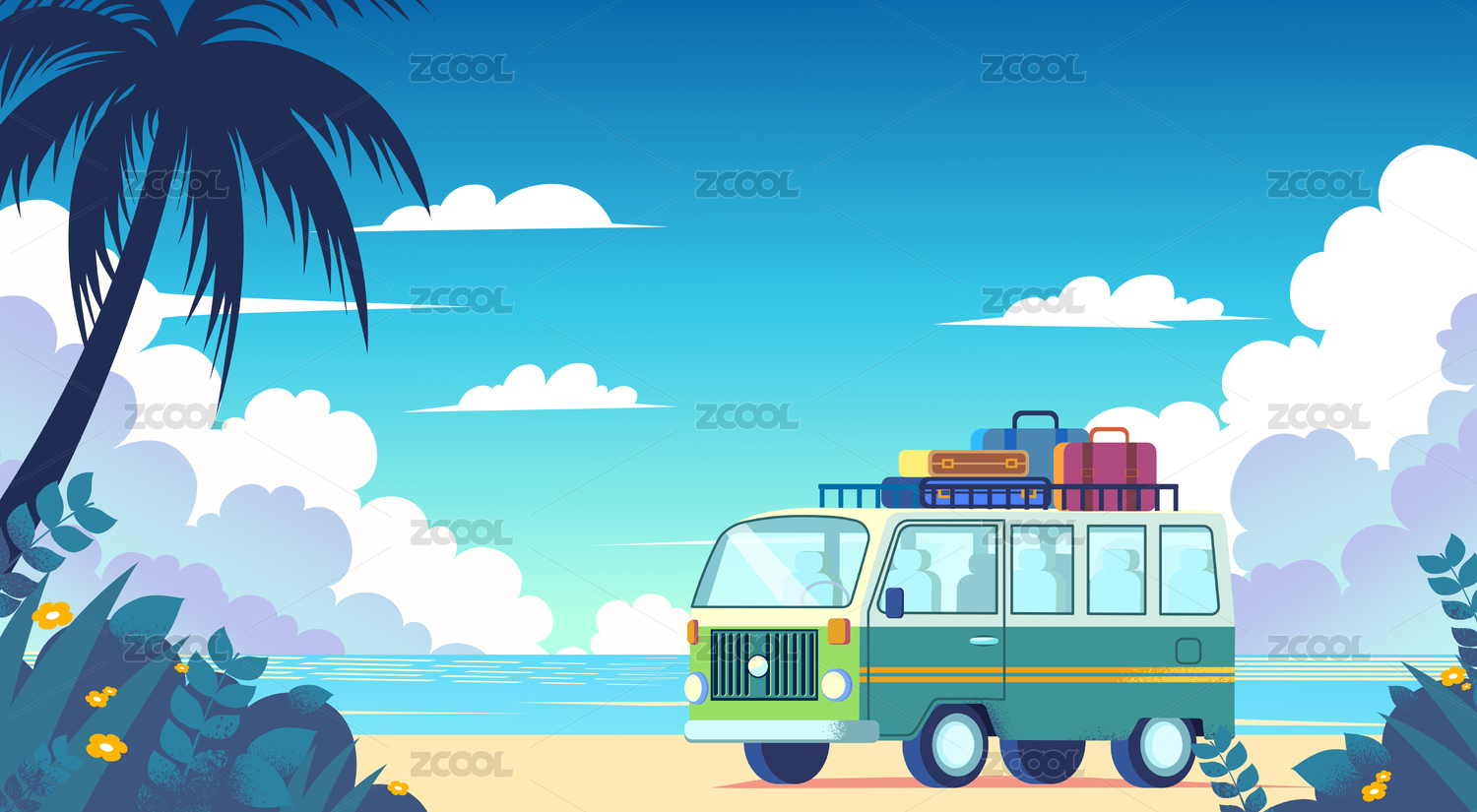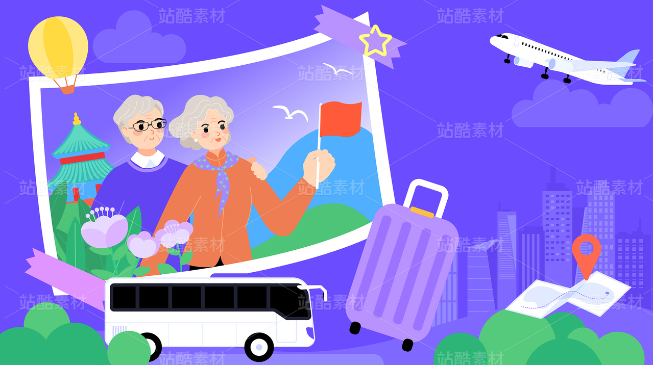 老年夫妻旅游大巴行李照片建筑地图矢量插画