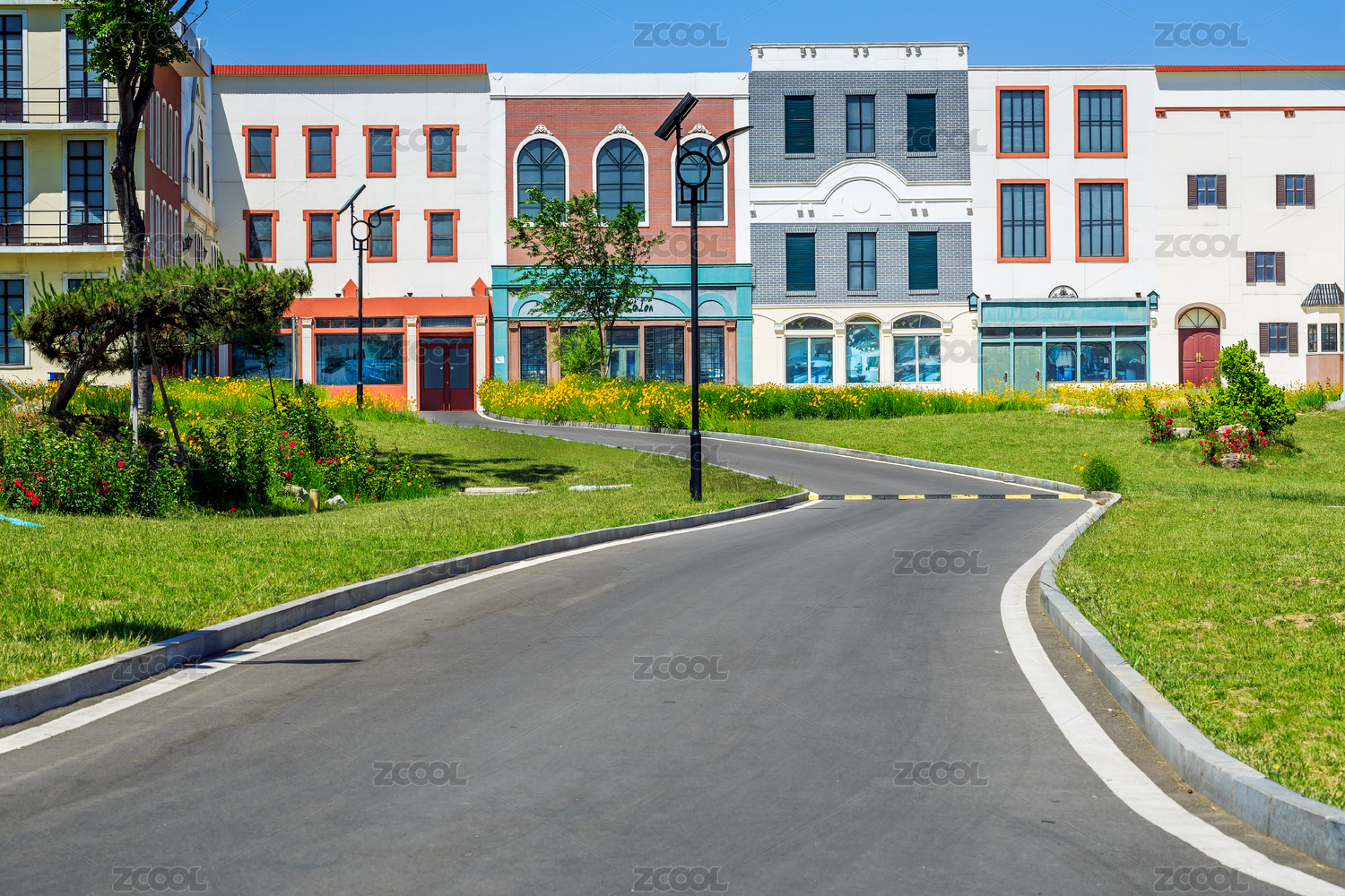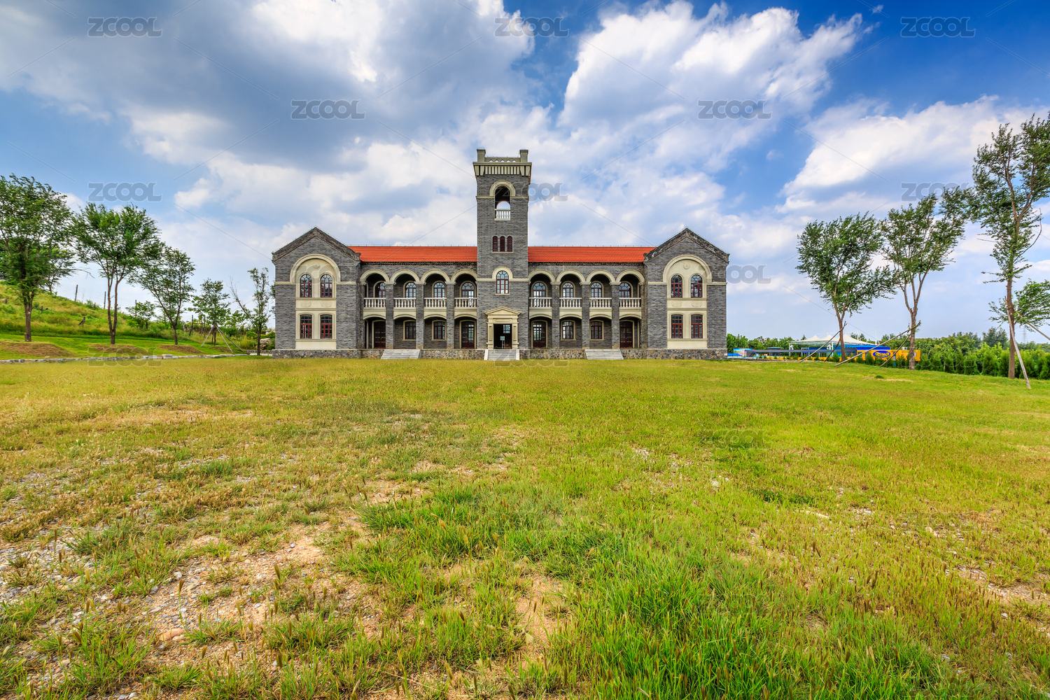 齐鲁酒地风景区的欧式建筑与蓝天白云草场