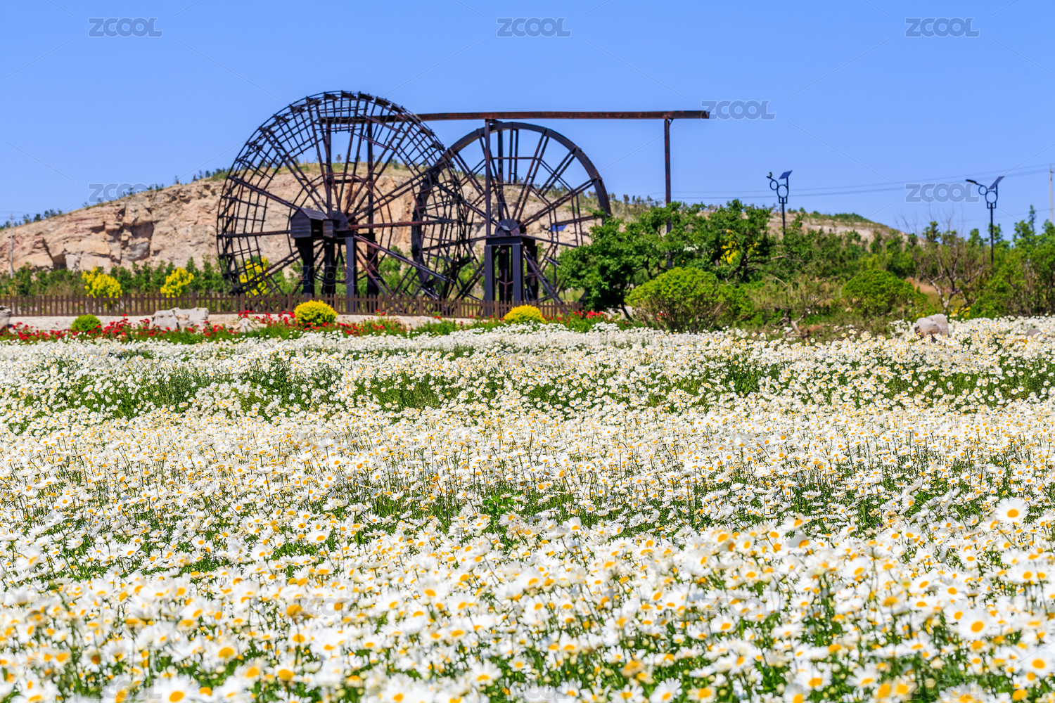 蓝天下水车花田,山东省安丘市齐鲁酒地景区