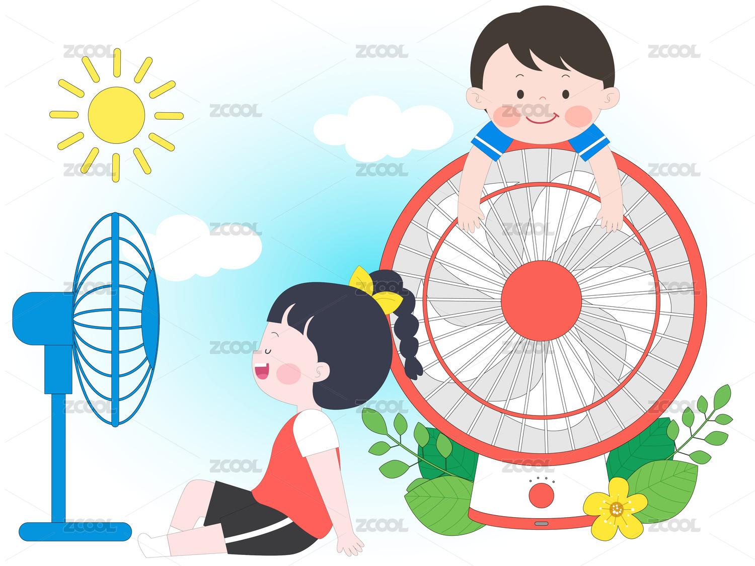 卡通儿童暑假夏天高温天气吹风扇防中暑插画