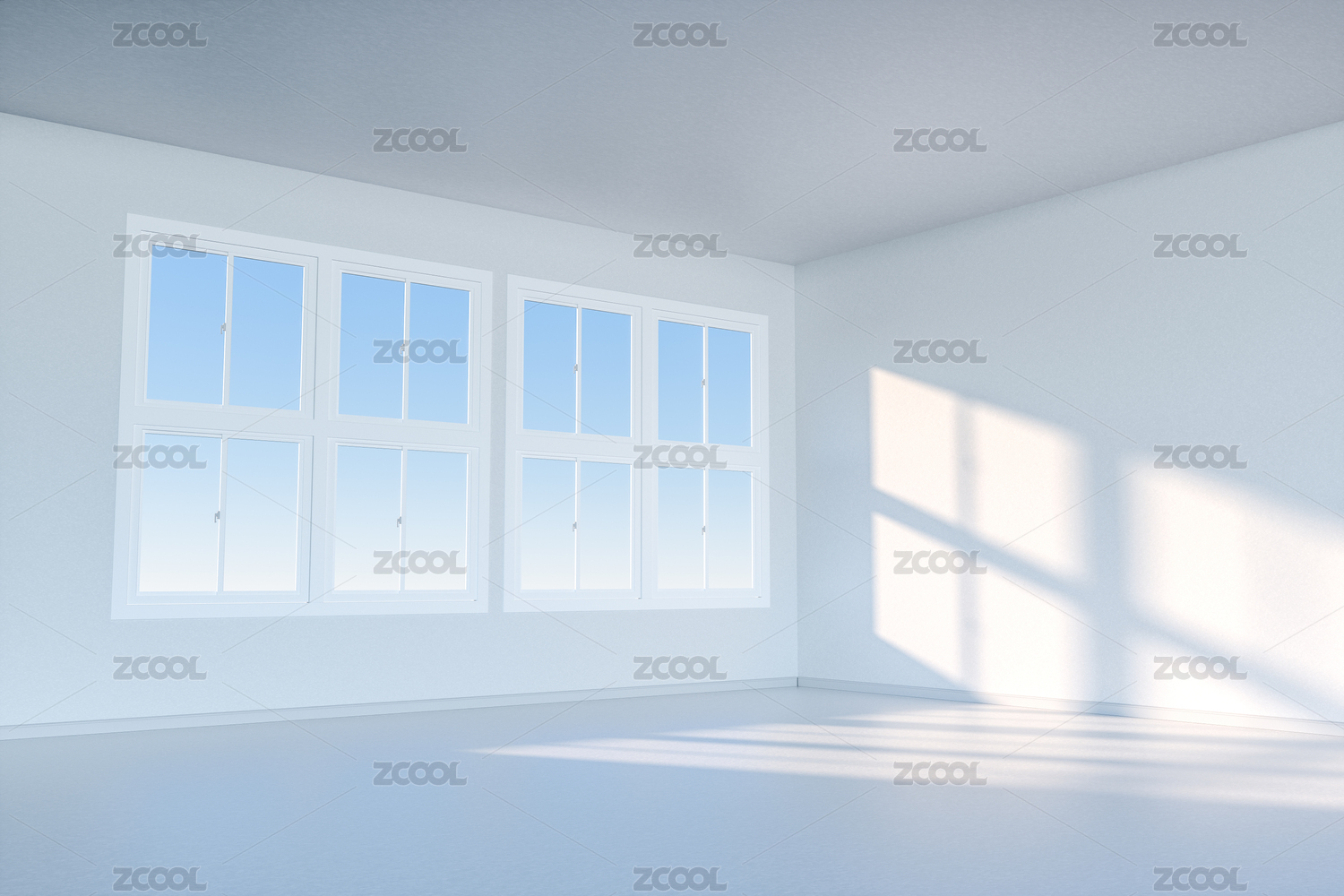 明亮的空房间与窗口的阳光,三维渲染