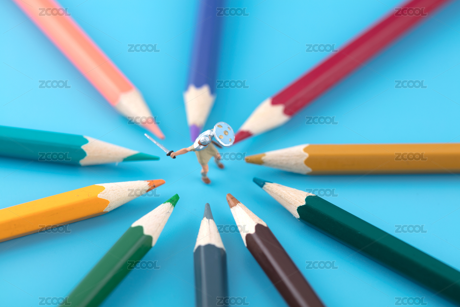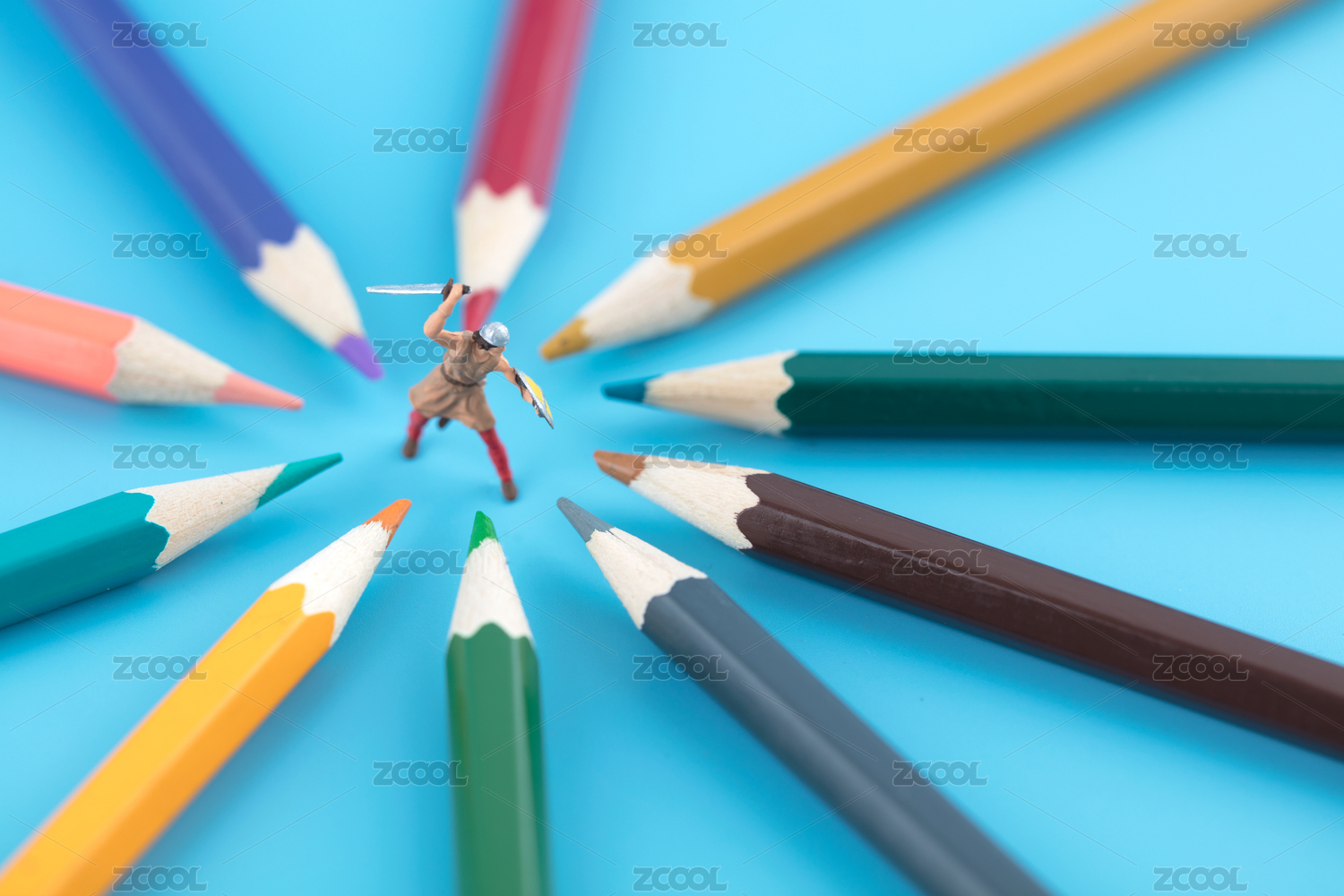 微缩创意被彩铅笔围绕斗争的武士