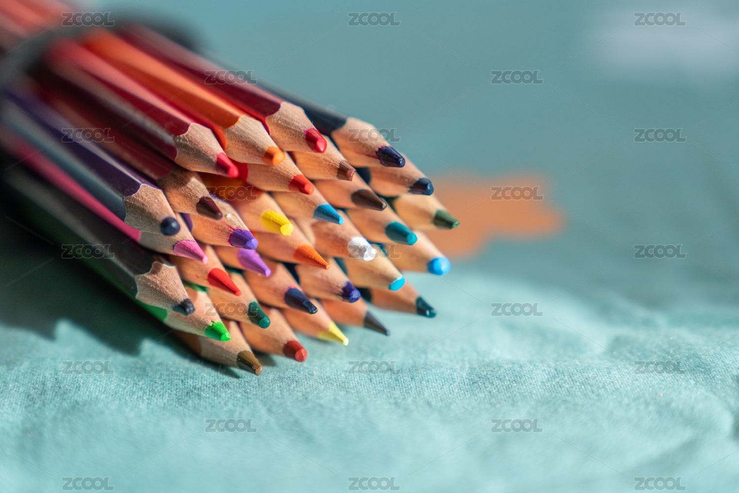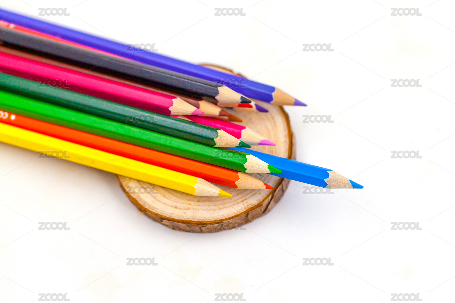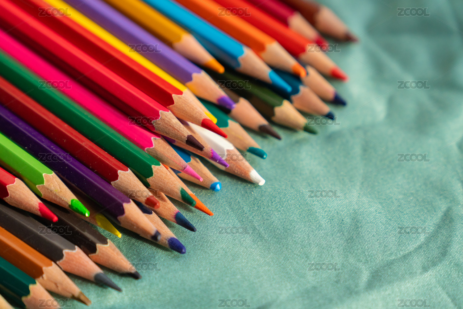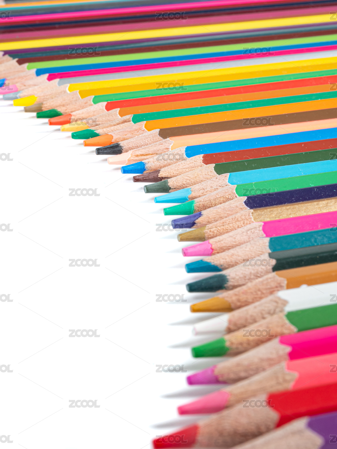圆弧状排列的彩铅笔尖特写图