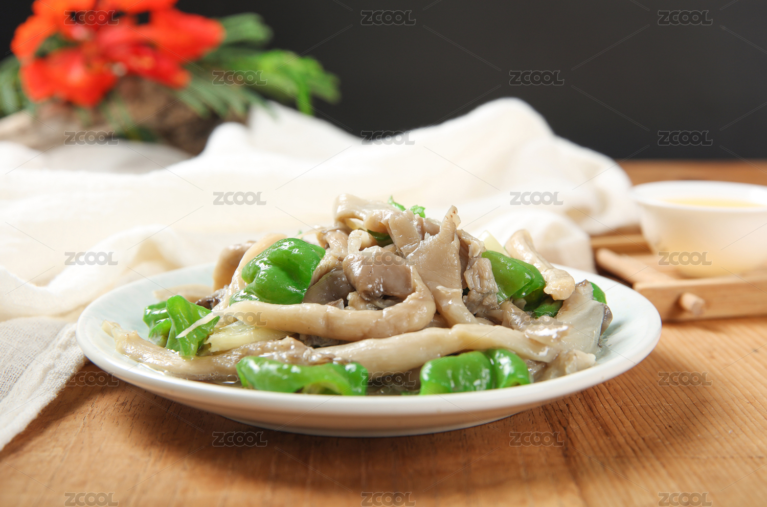 放在木桌上的一盘炒菜白平菇
