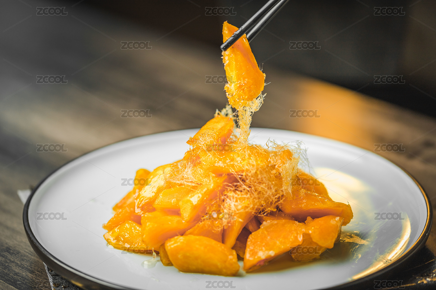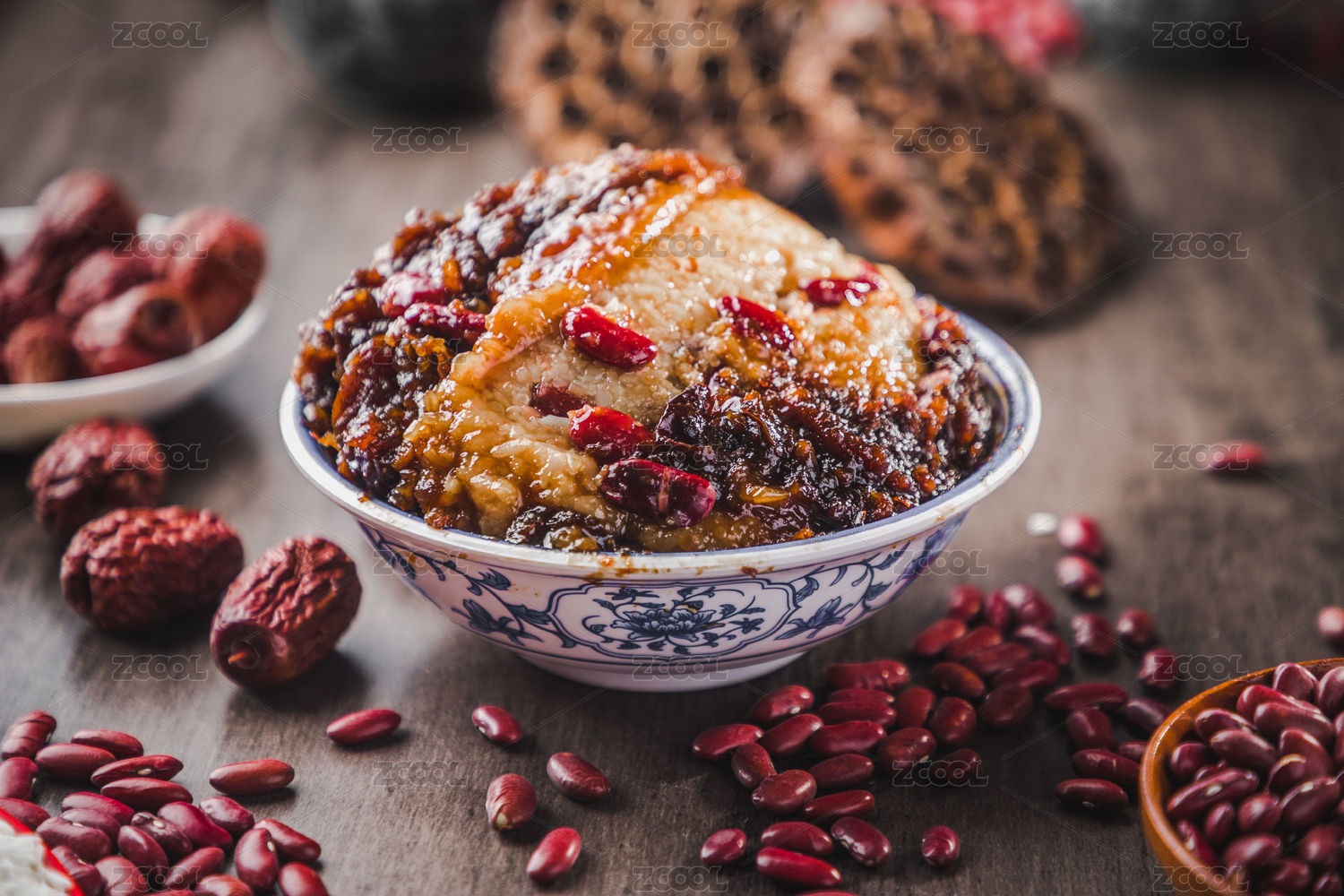暗色木纹桌面上放着一碗红豆枣泥甄糕