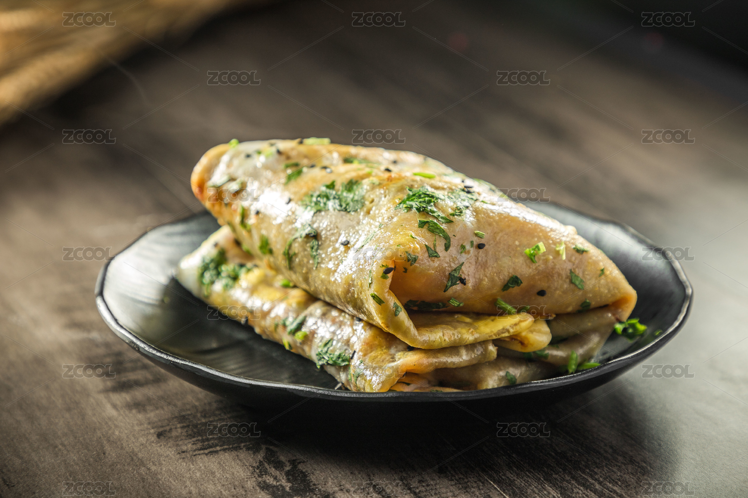 暗色木纹卓上放着一盘切夹着油条的煎饼