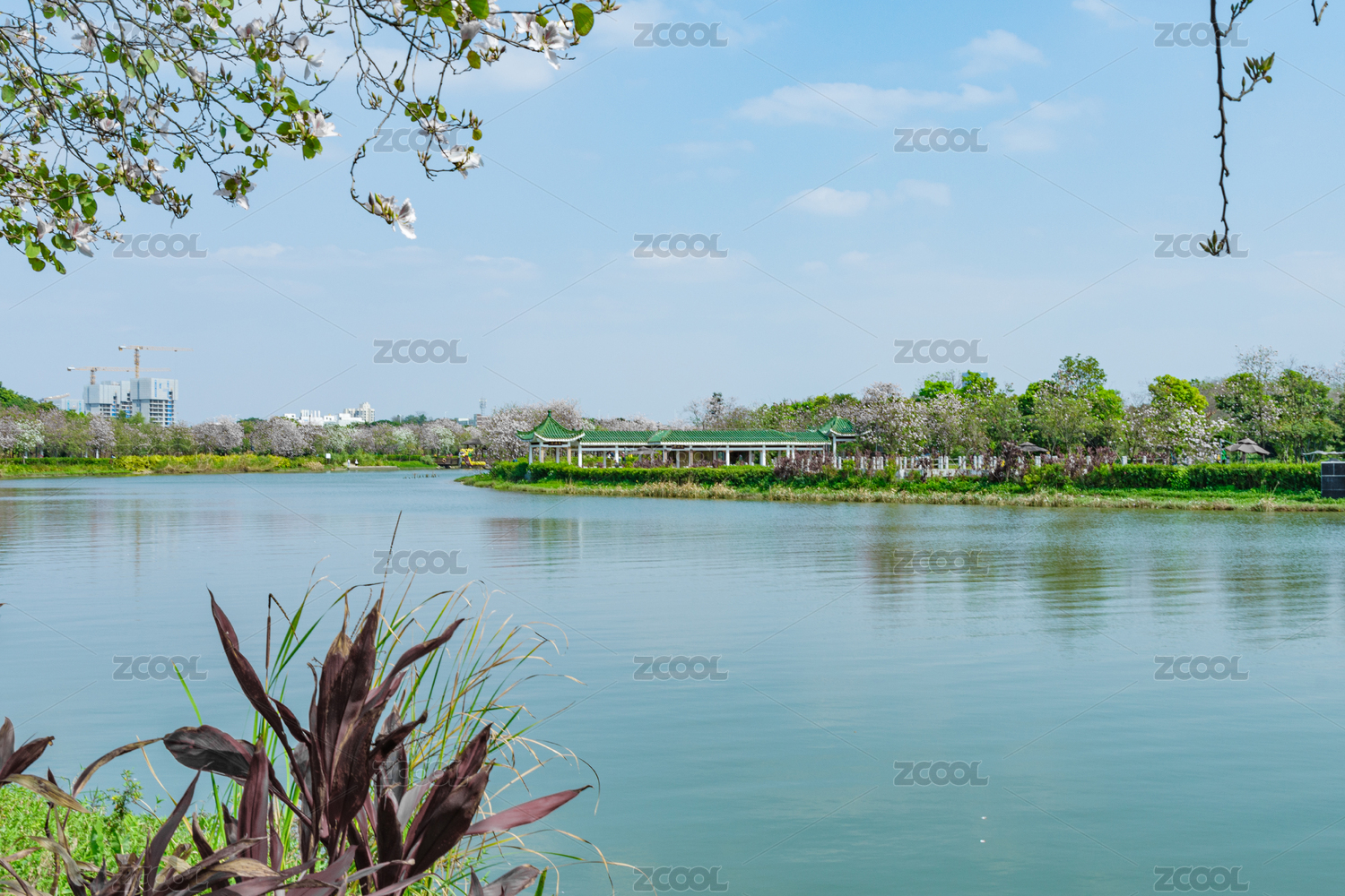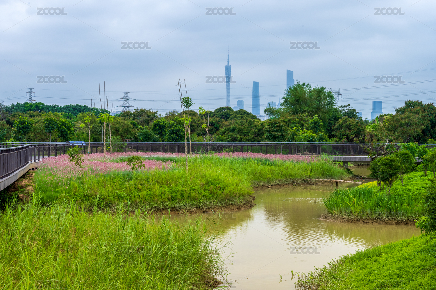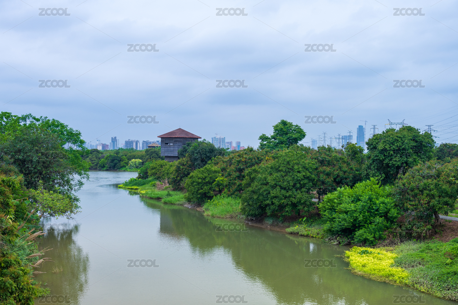 广州海珠湿地公园湖泊河流与凉亭走廊