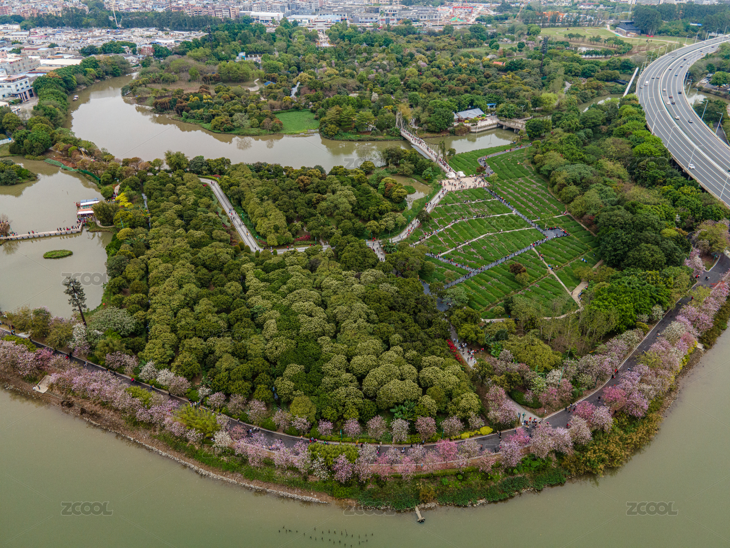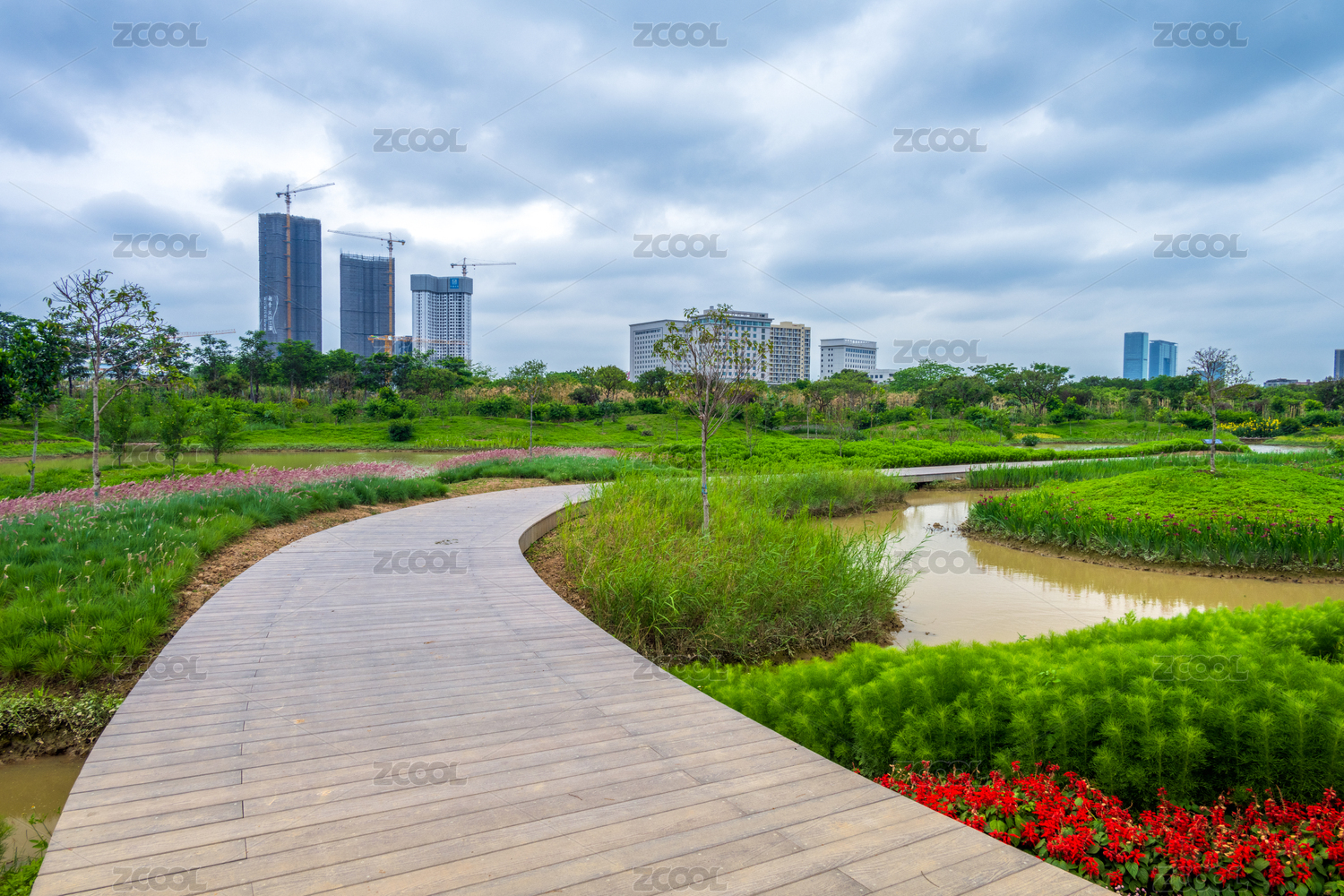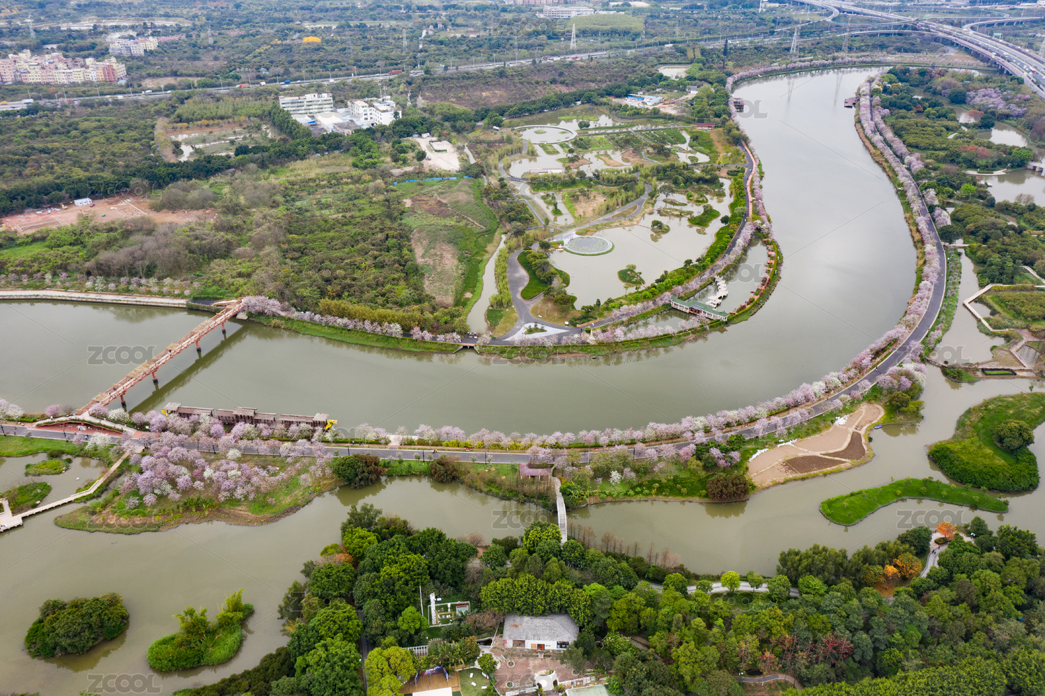 广州海珠湿地公园湖泊河流与凉亭走廊
