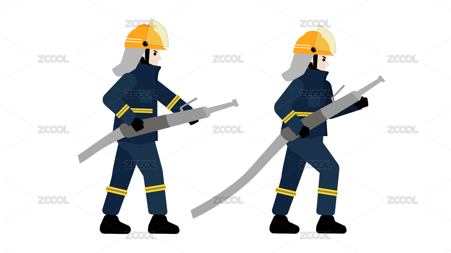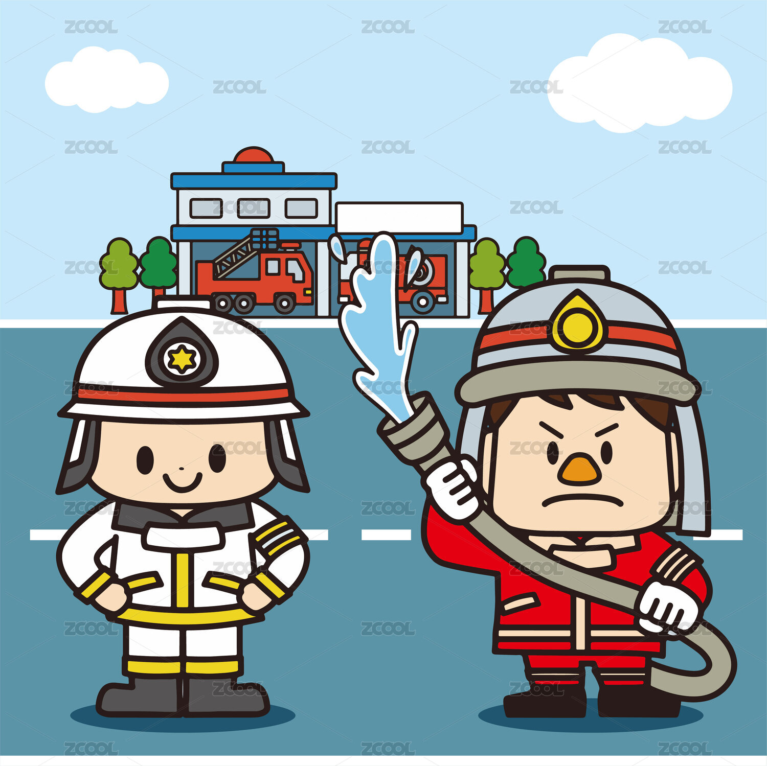 可爱卡通风格的两名消防员手持灭火器水管消