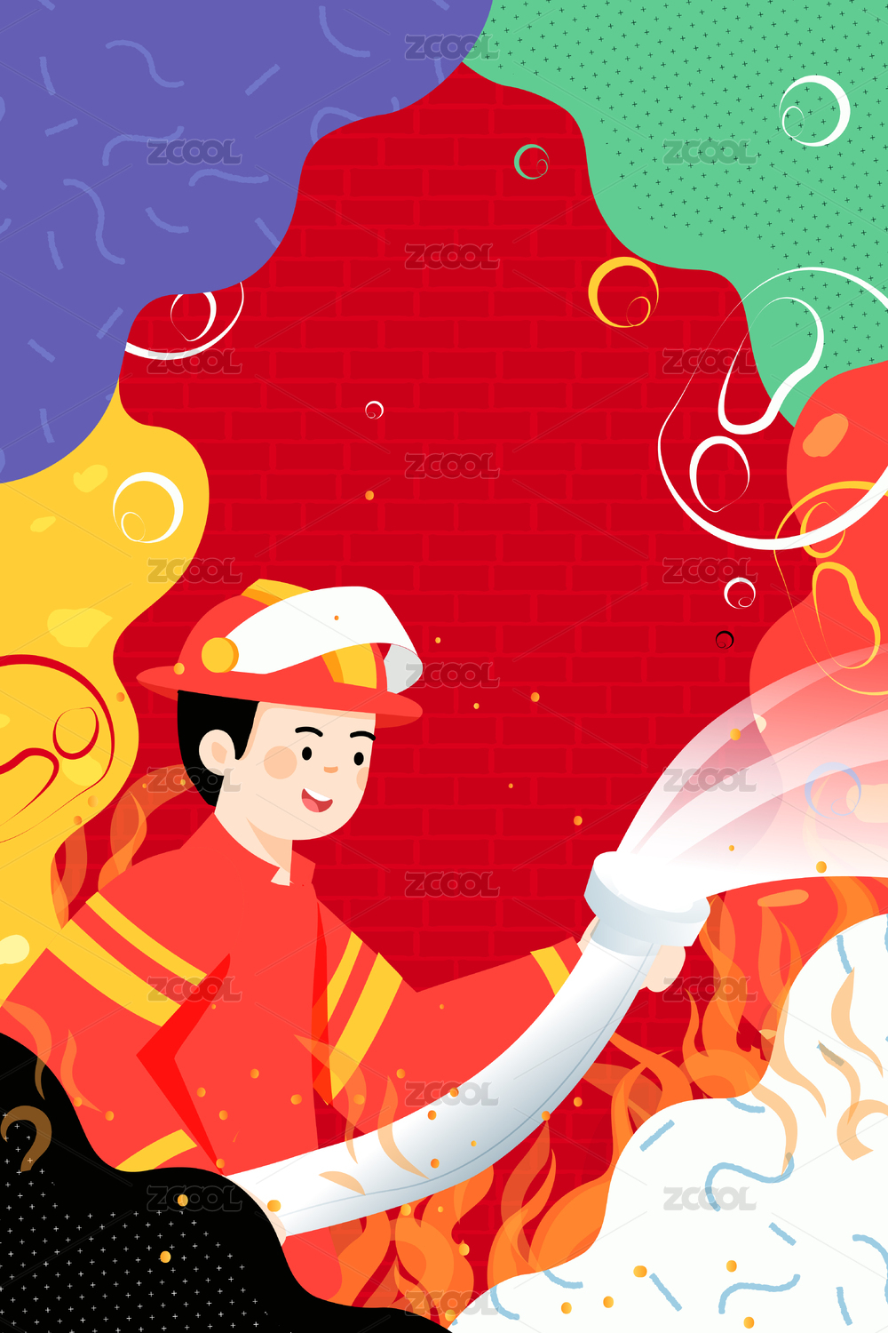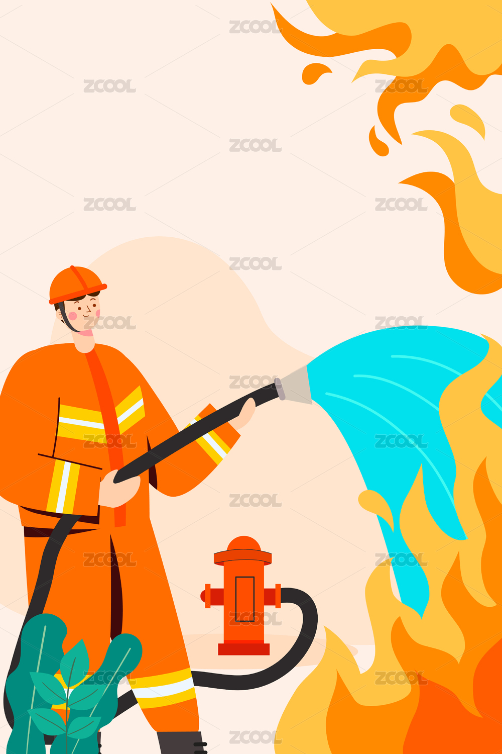一个拿着高压水枪灭火的消防员插画