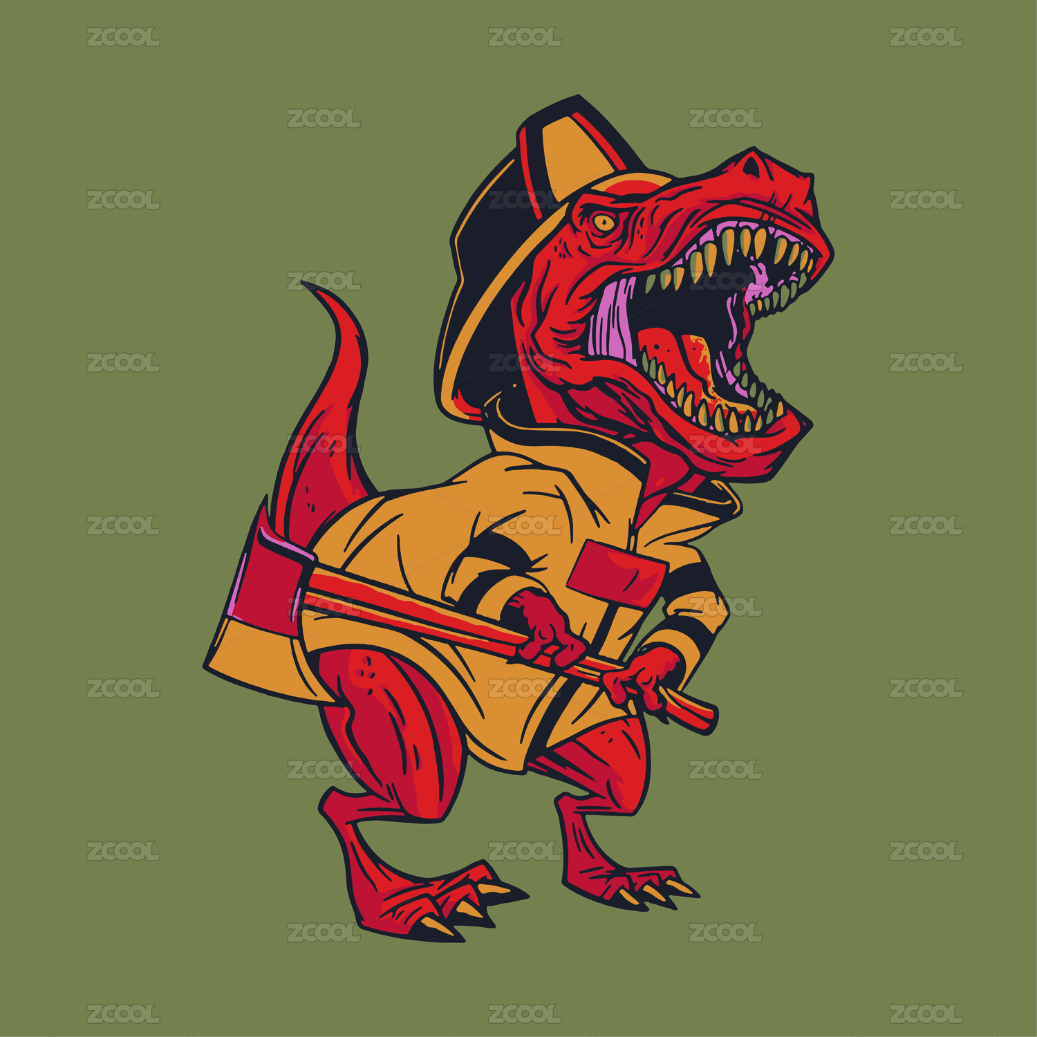 手持消防斧头的暴龙消防员手绘图案