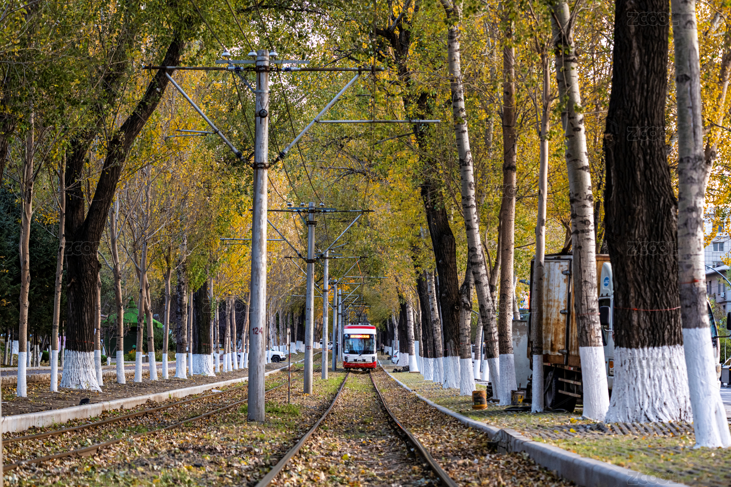 中国长春有轨电车与落叶景观