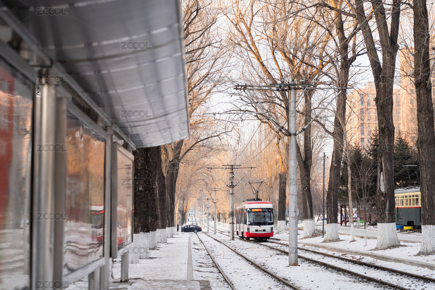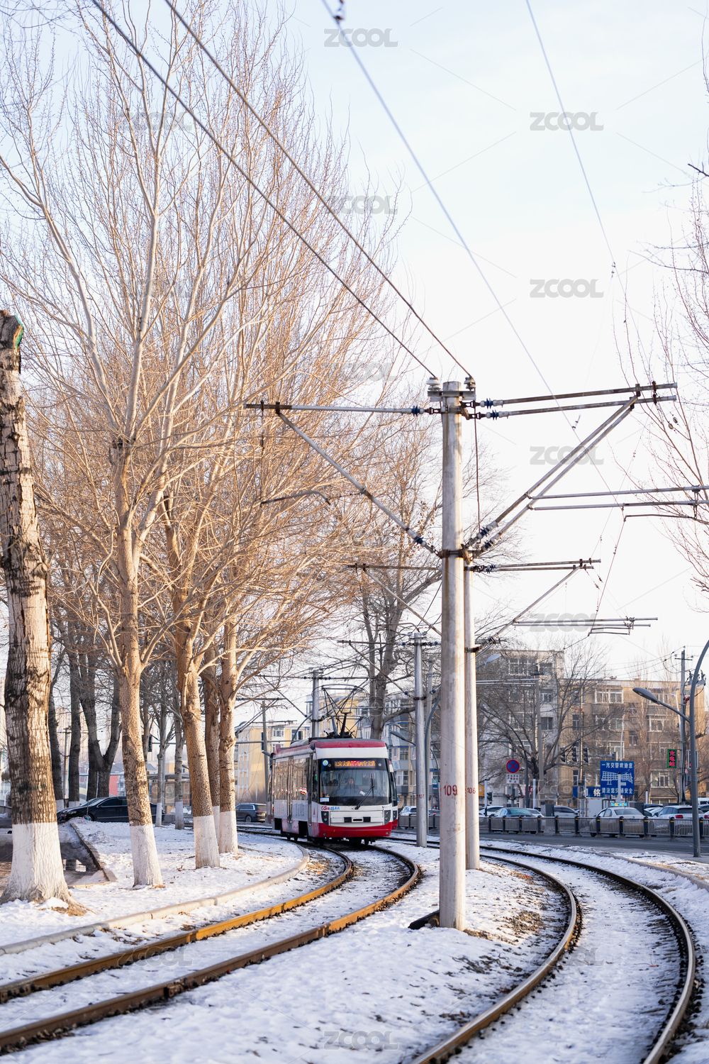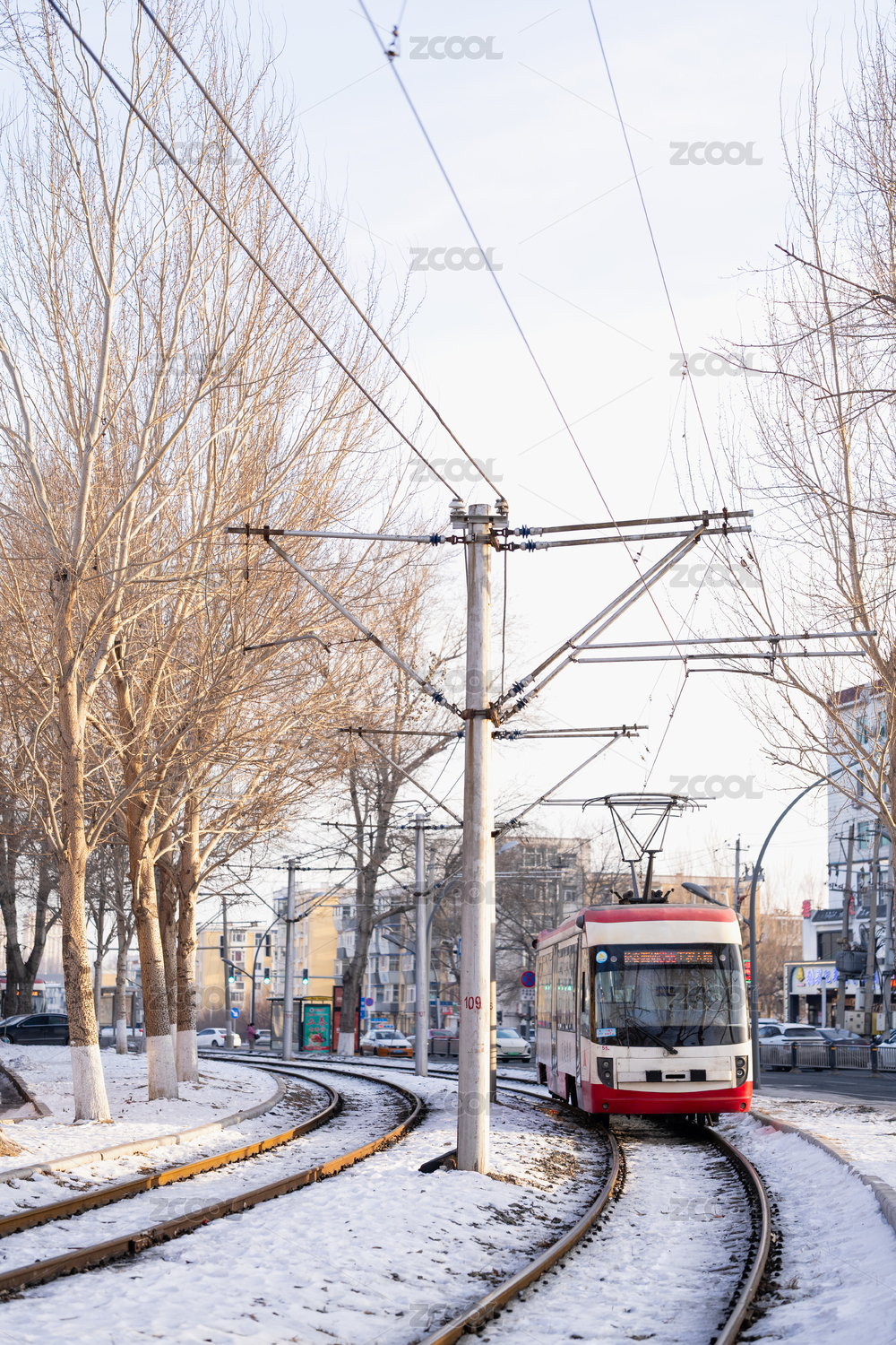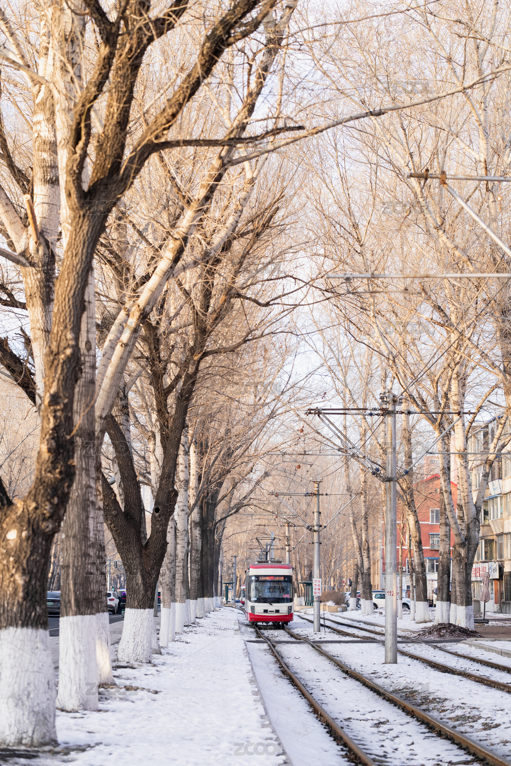 中国吉林长春冬季雪后有轨电车