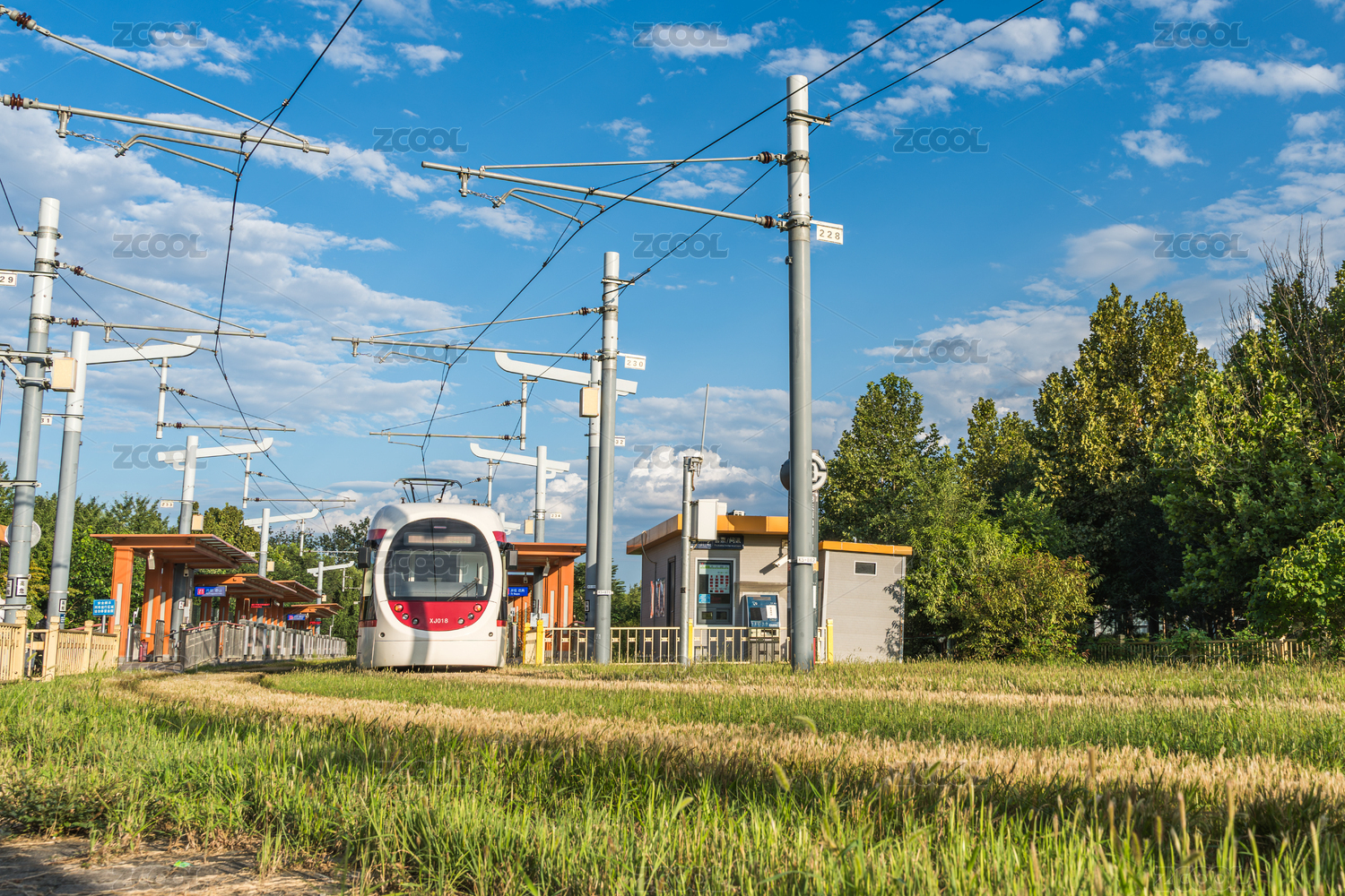 北京西郊线户外草地旁的有轨电车及电线设施
