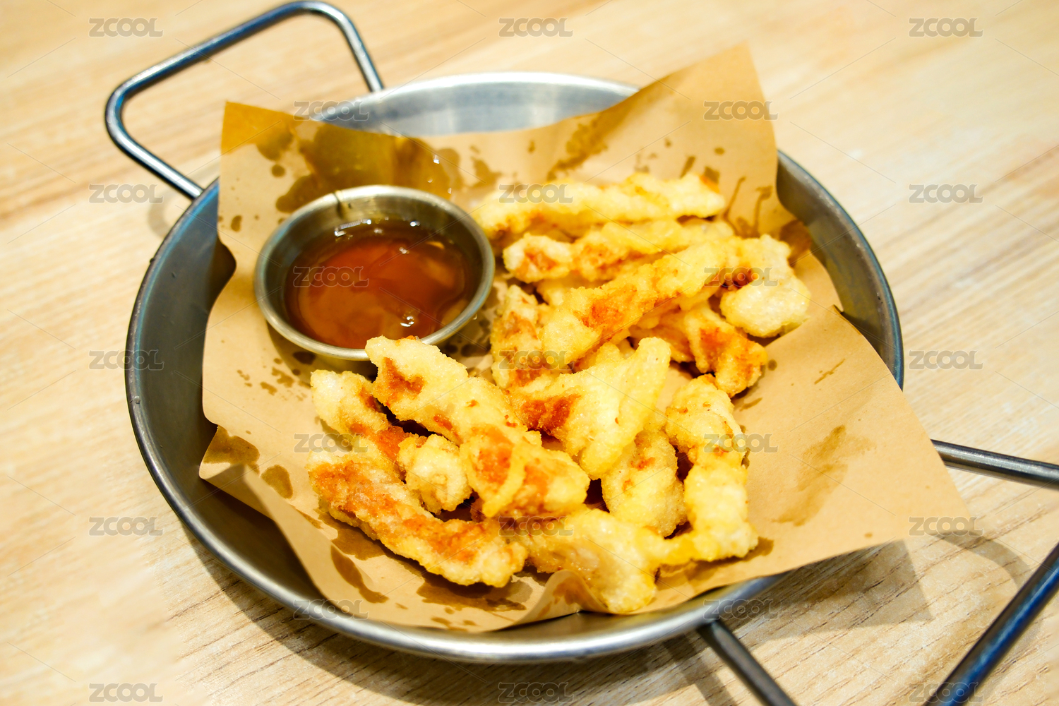 一堆裹着酱汁的韩式炸鸡配炸年糕